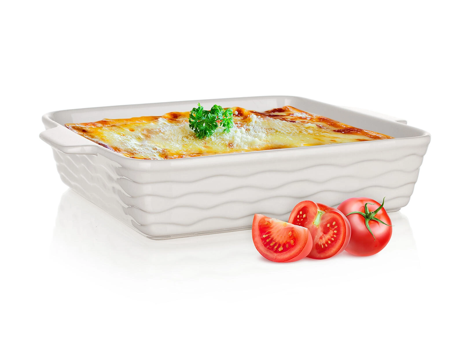 Het hoogwaardige keramische materiaal absorbeert en geeft warmte geleidelijk af, zodat je lasagne, gegratineerde pasta en groenten gelijkmatig garen zonder aan te branden.