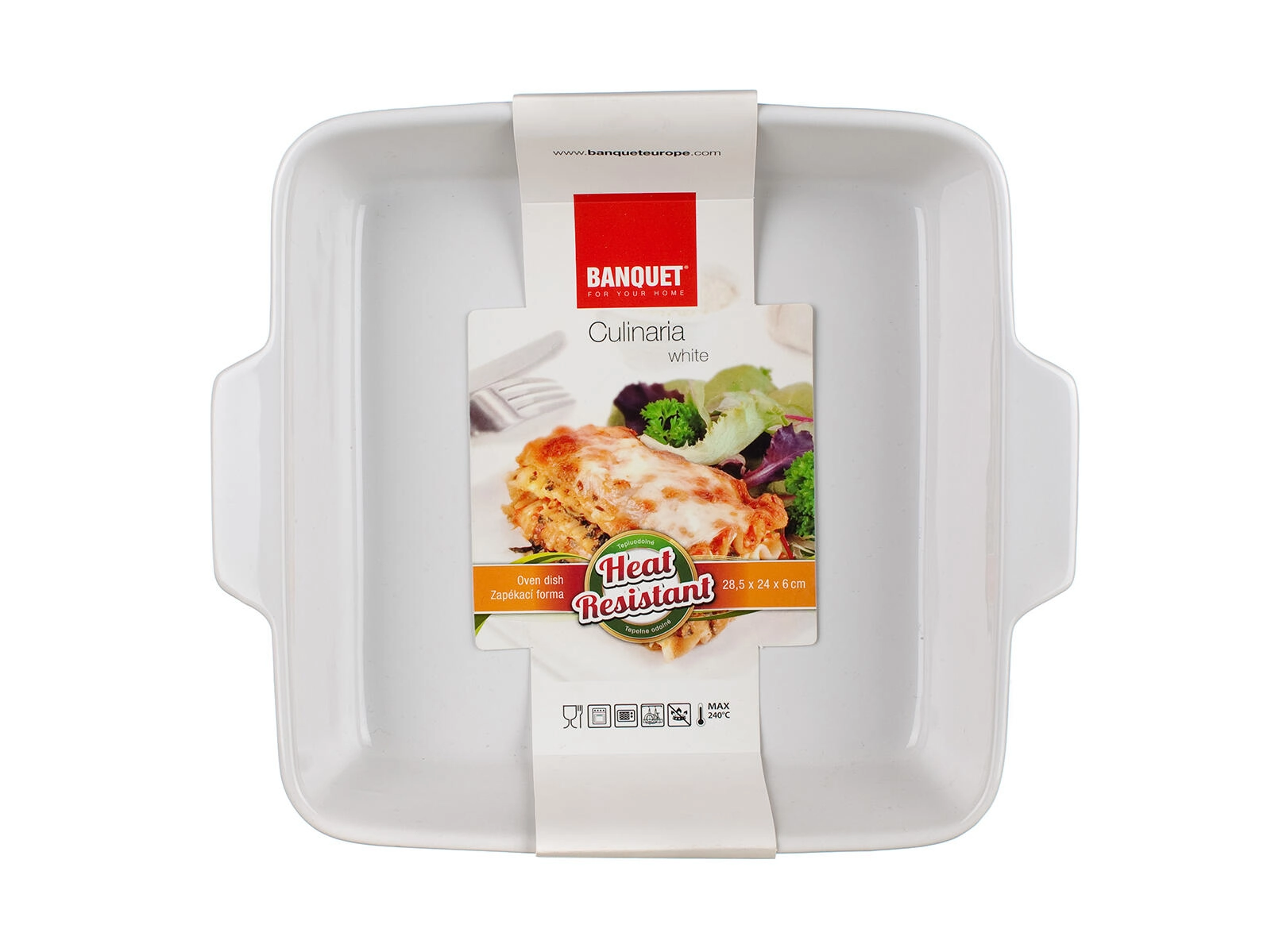 Rechthoekige keramische schaal CULINARIA White met afmetingen 28,5 × 24 × 6 cm, ideaal voor lasagne, gegratineerde pasta, groenten en zoete ovengerechten. Hoogwaardig keramiek accumuleert en geeft warmte geleidelijk af, waardoor gerechten gelijkmatig garen en bij het serveren langer warm blijven.