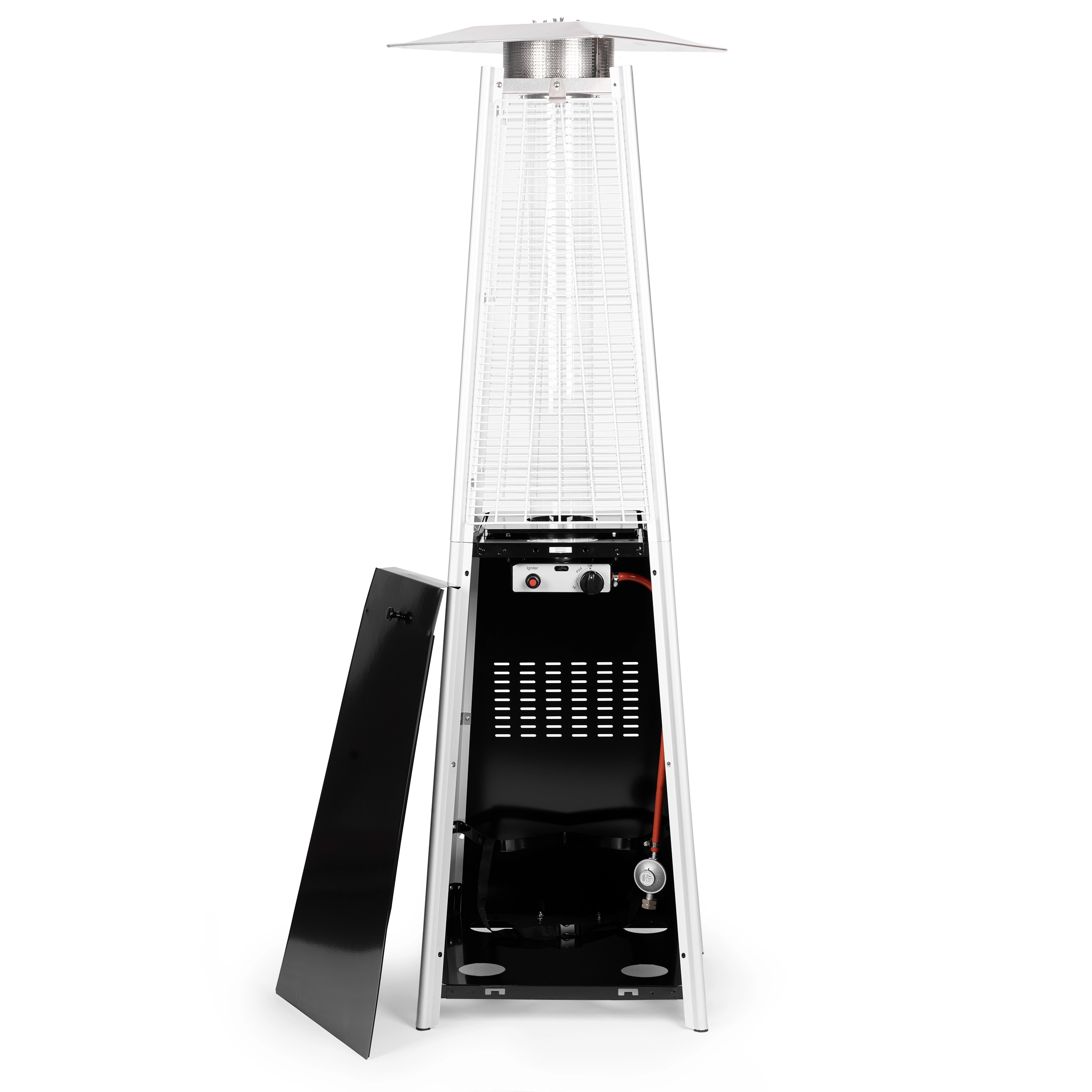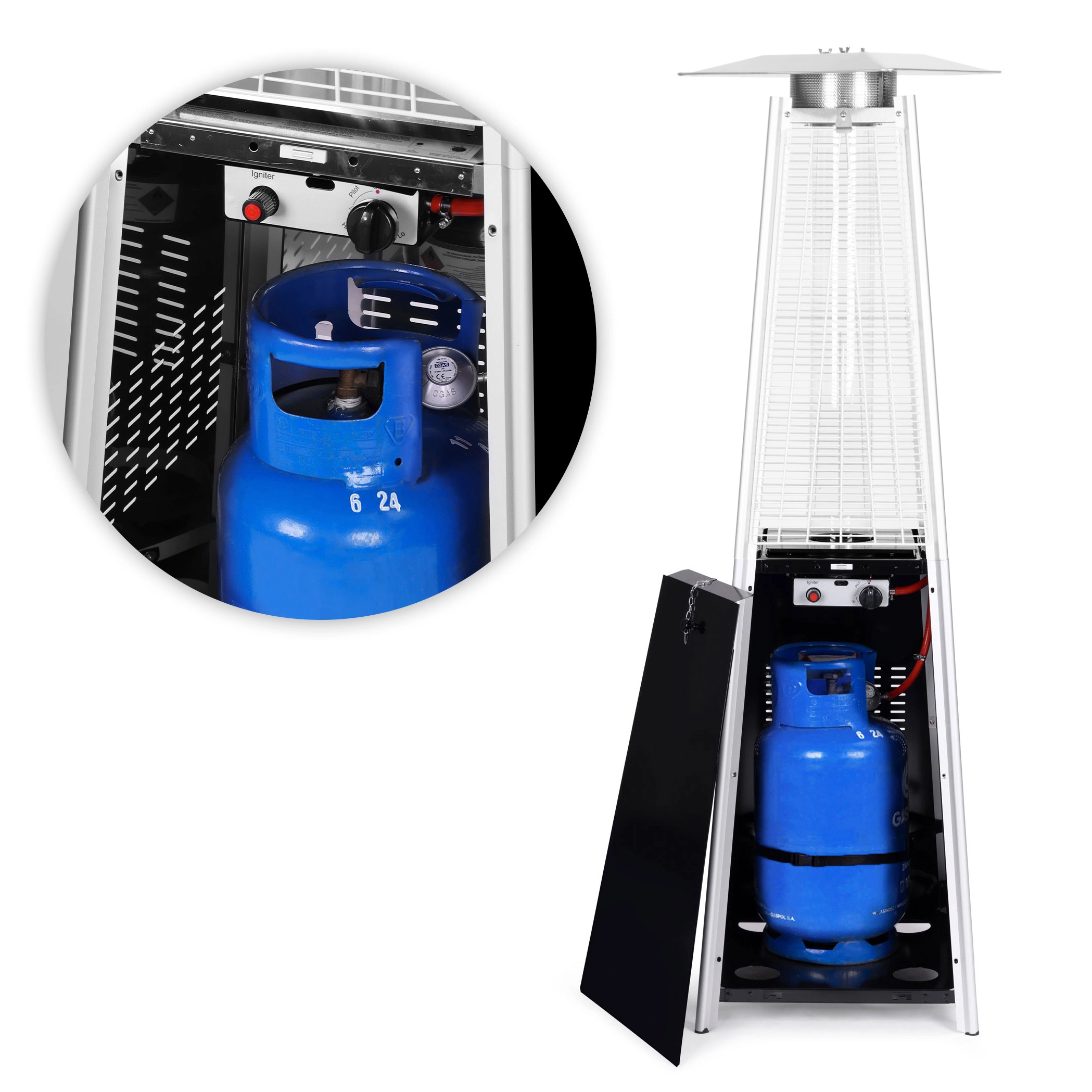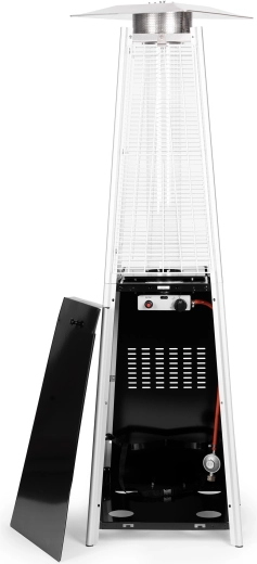 Voor maximale veiligheid beschikt de verwarmer over een afsluitbare ruimte voor de LPG-fles (tot 11 kg) met een bevestigingsriem. De verpakking bevat een drukregelaar met slang en een waterdichte hoes ter bescherming tegen regen en stof. De ideale oplossing voor buiten zitten het hele jaar door.