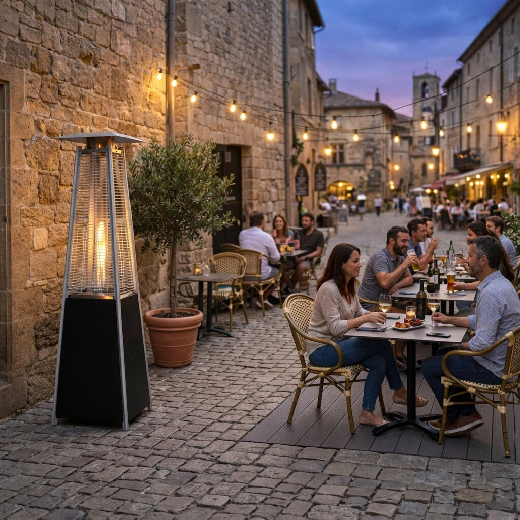 De krachtige brander met glazen schild creëert een hoge, zichtbare vlam en straalt warmte in alle richtingen. Ideaal voor terrassen, tuinen en horecaterrassen.