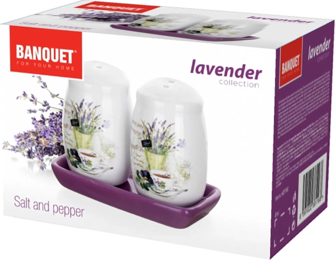 Stijlvolle keramische set zout- en pepervaatje met lavendelmotief brengt een Provençaalse sfeer in je keuken. Inclusief een praktisch paars schaaltje. Dankzij het glazuur is het eenvoudig te onderhouden en geschikt voor de vaatwasser (voor het langdurig behoud van het uiterlijk raden we handafwas aan).