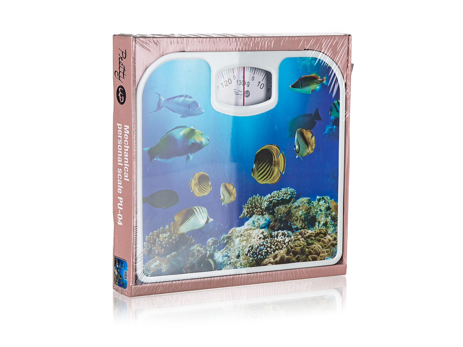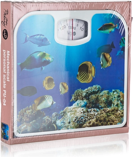 Deze mechanische personenweegschaal combineert betrouwbare functionaliteit met een aantrekkelijk design. De onderwaterwereld-decoratie geeft je badkamer een frisse uitstraling, terwijl de analoge schaal tot 130 kg zorgt voor snel en duidelijk aflezen van je gewicht.