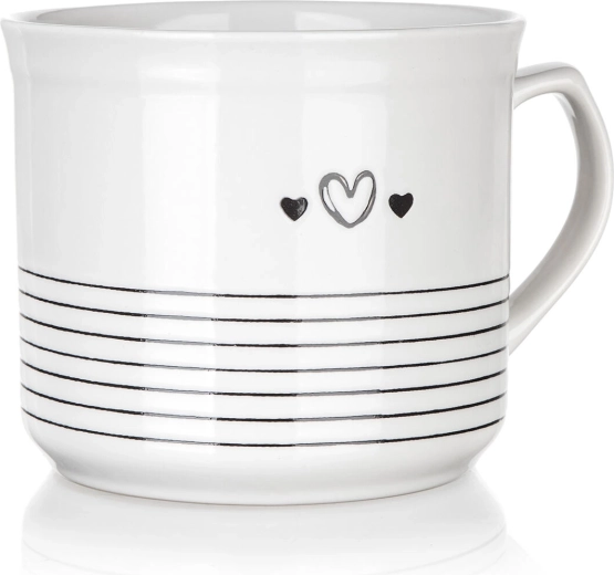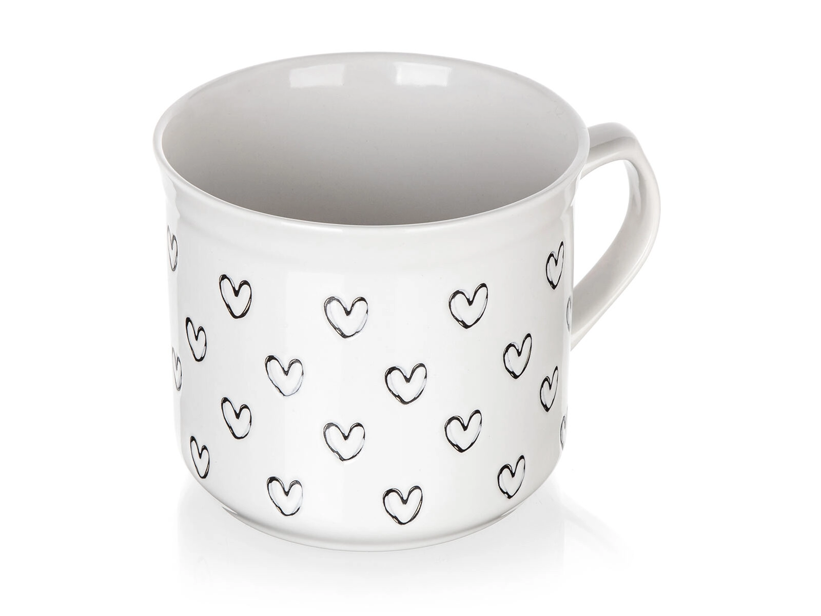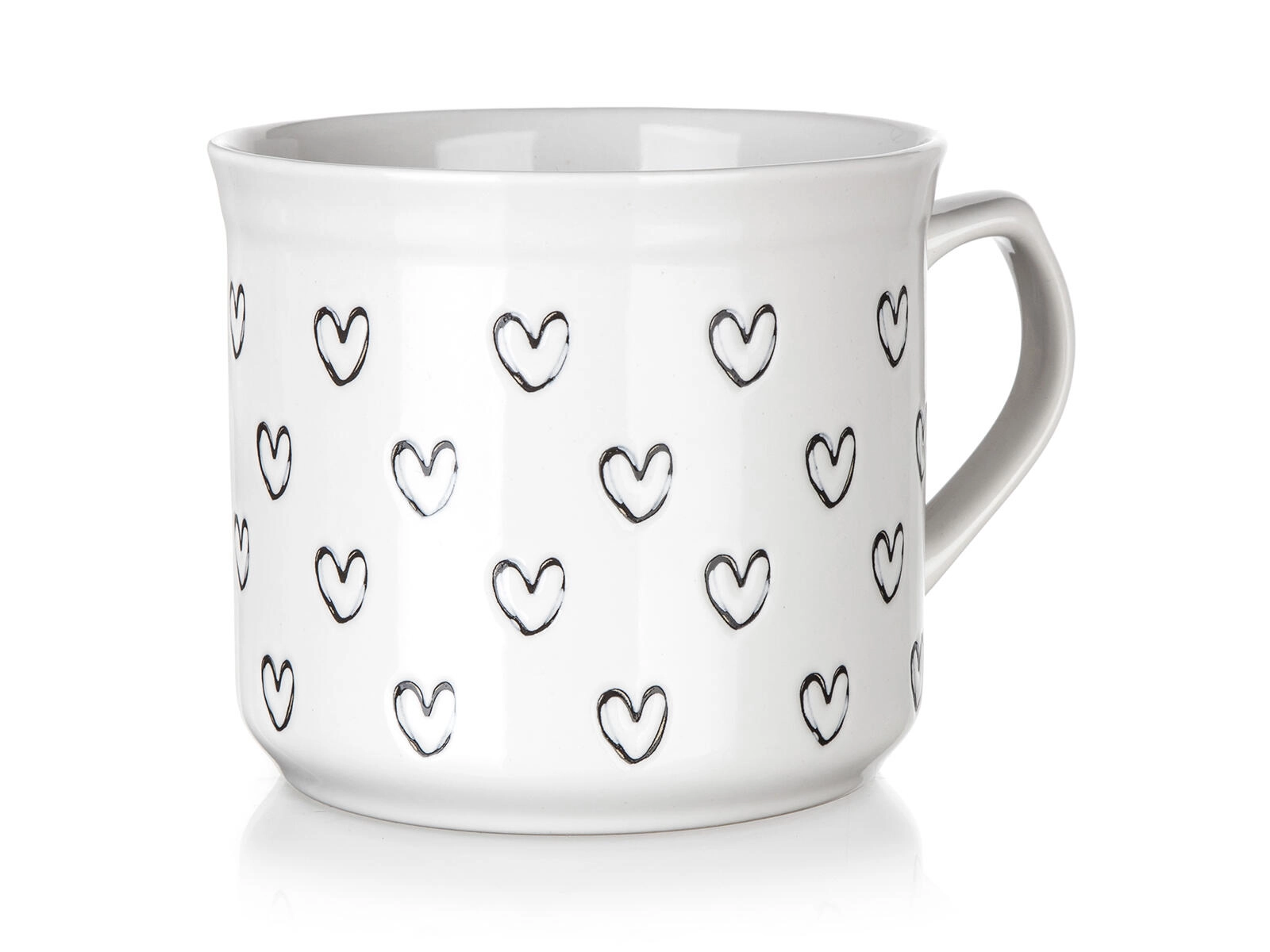 Geniet in stijl van je favoriete warme dranken met deze grote keramische mok met hartjes in penstijl. Dankzij de inhoud van 660 ml is hij perfect voor een lange ochtendkoffie of een stevige kruidenthee. De glanzende glazuurlaag en de zuiver witte basis met zwarte details geven je keuken tijdloze elegantie.