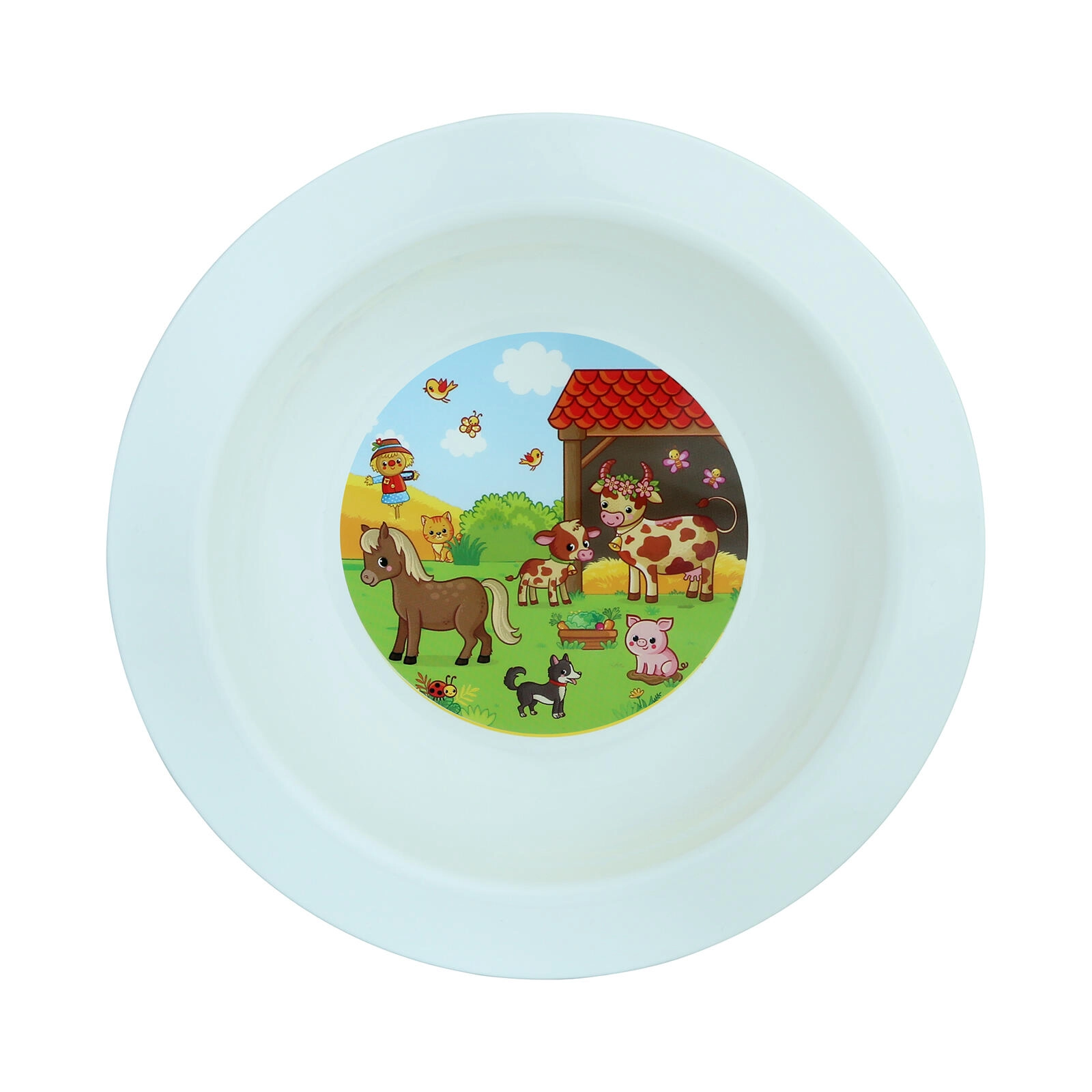 Het diepe kinderbord met een speelse boerderijdruk motiveert kinderen om zelfstandig te eten. Dankzij het lichte en stevige plastic ligt het prettig in de hand, is het valbestendig en ideaal voor dagelijks gebruik thuis en onderweg.