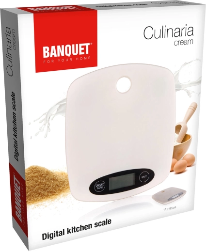 De praktische en stijlvolle digitale weegschaal BANQUET Culinaria Cream is de ideale hulp voor dagelijks koken en bakken. Dankzij het slanke, platte ontwerp is ze gemakkelijk op te bergen, de crèmekleur past in elke keuken en het overzichtelijke LCD-display zorgt voor comfortabel aflezen.