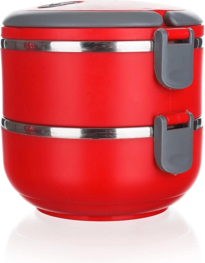 Praktische tweelaagse etensdrager CULINARIA Red, ideaal voor onderweg, op het werk en naar school. Dankzij twee gescheiden kommen met een totaalvolume van 1,1 l blijft het eten overzichtelijk verdeeld, veilig afgesloten en beter thermisch geïsoleerd door de roestvrijstalen inzetstukken. Stevige zijklemmen en een inklapbaar handvat voor gemakkelijk dragen zorgen voor comfort zonder morsen.