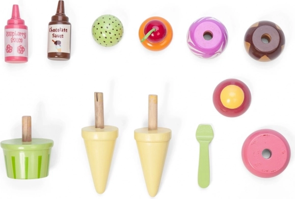 Afneembare bolletjes, hoorntjes en een bekertje nodigen uit om “smaken” te mixen en te versieren met frambozen- of chocoladesaus. Perfect voor een spelletje ijssalon.