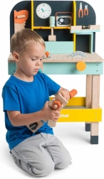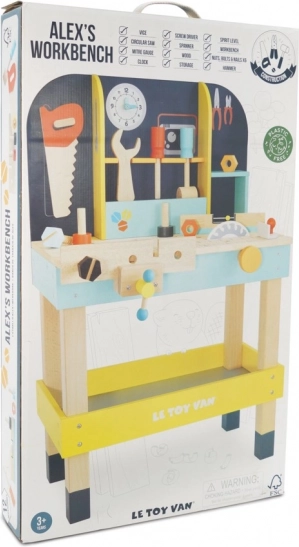 De houten kinderwerkbank ALEX van LE TOY VAN biedt alles wat jonge reparateurs nodig hebben voor realistisch spel. Dankzij de stevige afwerking van gecertificeerd FSC-hout en niet-giftige verven is hij veilig, duurzaam en milieuvriendelijk. Inclusief ingebouwde cirkelzaag, meetlat en werkbankschroef, een bovenplank met haken en een onderste opbergruimte voor extra uitrusting.