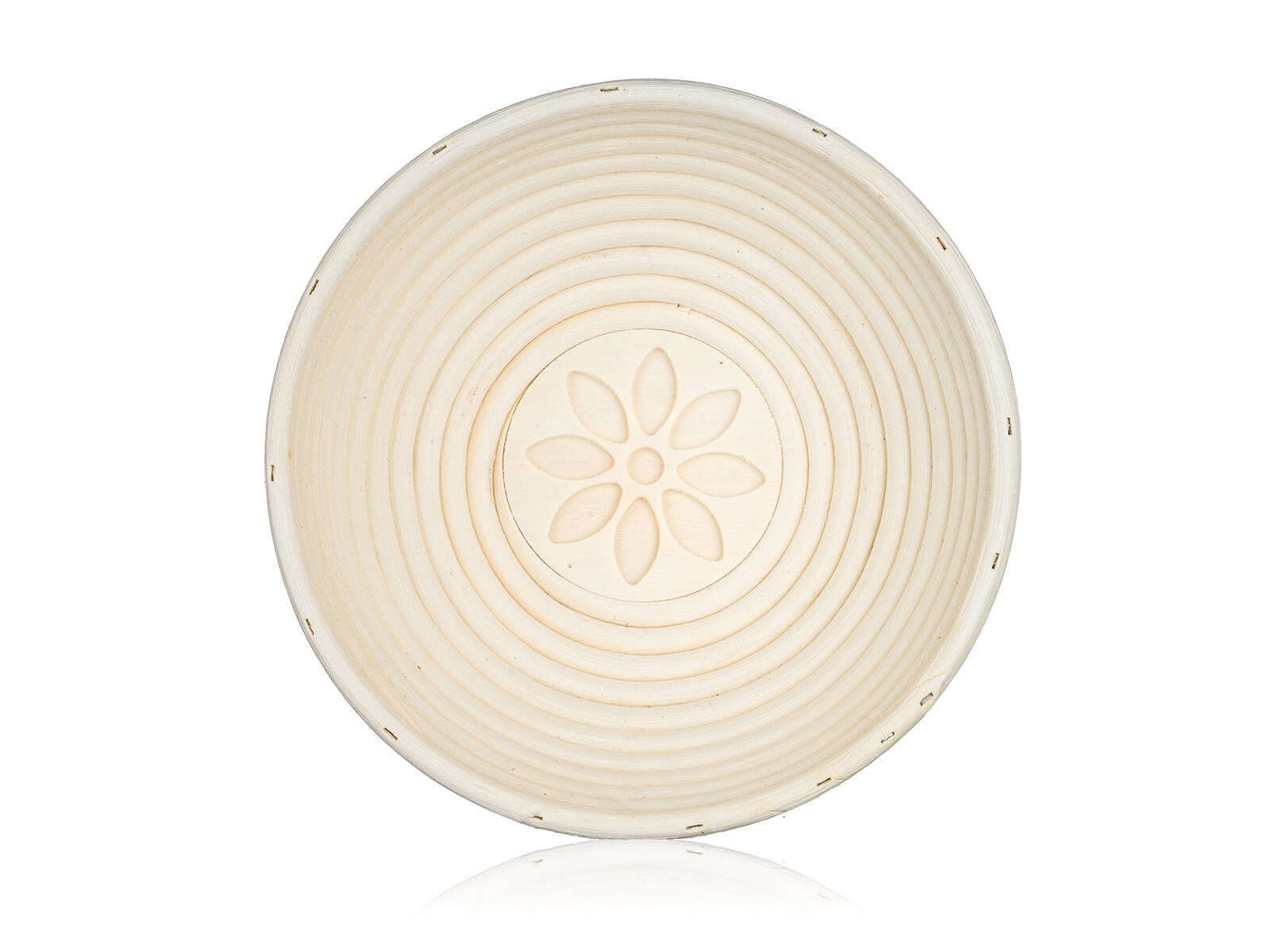 Ronde rijsmand van natuurlijk riet (rotan) met een diameter van 21 cm en een bloemendecor op de bodem, ideaal voor het laten rijzen van brooddeeg. De spiraalvormige groeven ondersteunen een gelijke fermentatie en creëren een aantrekkelijk patroon op de korst. Licht, ademend en eenvoudig te onderhouden – gewoon afnemen met een vochtige doek.