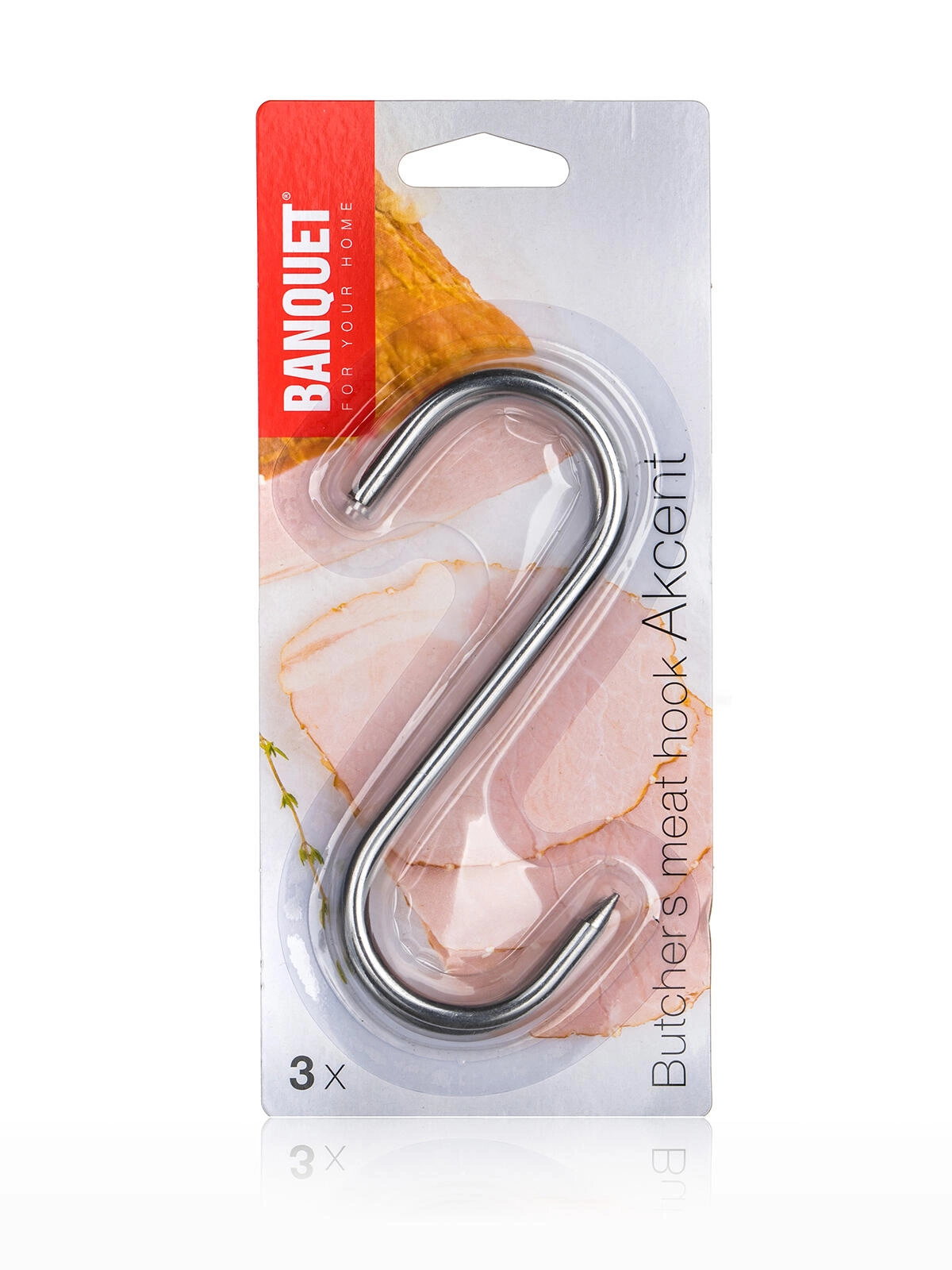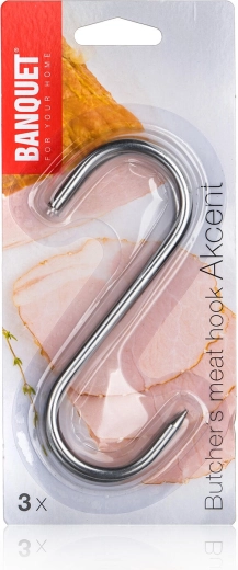 Praktische roestvrijstalen AKCENT-haakjes voor het eenvoudig ophangen van vlees in de rookoven. Gemaakt van stevige draad met een diameter van 5 mm, in een verpakking van 3 stuks. Geschikt voor een ophangbuis tot een diameter van 35 mm en ontworpen voor het veilig ophangen van vlees en worstwaren.