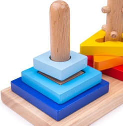 Dit slimme houten speelgoed motiveert kinderen om te ontdekken. De stukjes worden op drie verschillende pinnetjes geplaatst, waarbij sommige een draai of juiste oriëntatie vereisen. Zo trainen kinderen spelenderwijs vingervaardigheid, geduld en ruimtelijk inzicht.