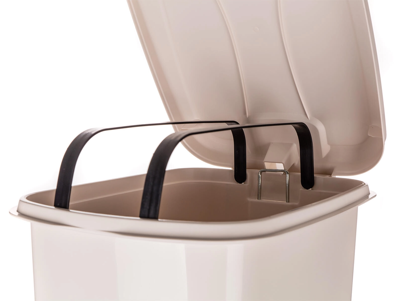 De rechthoekige vorm bespaart ruimte tegen de muur of in een hoek en de gladde oppervlakken maken het onderhoud eenvoudig. De interne bevestiging van de zak houdt de emmer schoon en de zak stevig op zijn plaats. Dankzij de subtiele crèmekleur past de emmer stijlvol in keuken, badkamer en kantoor.