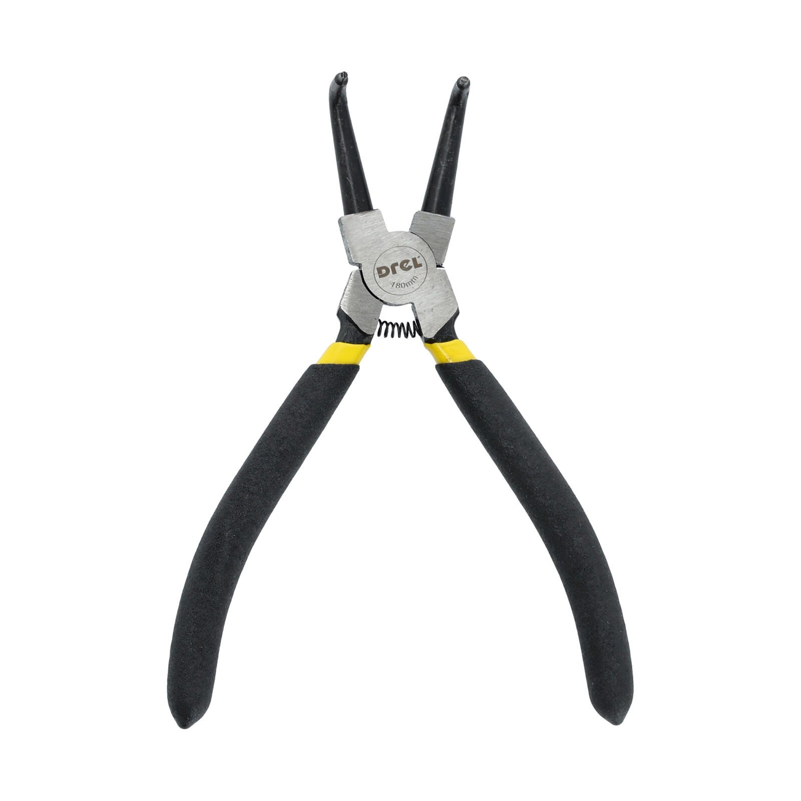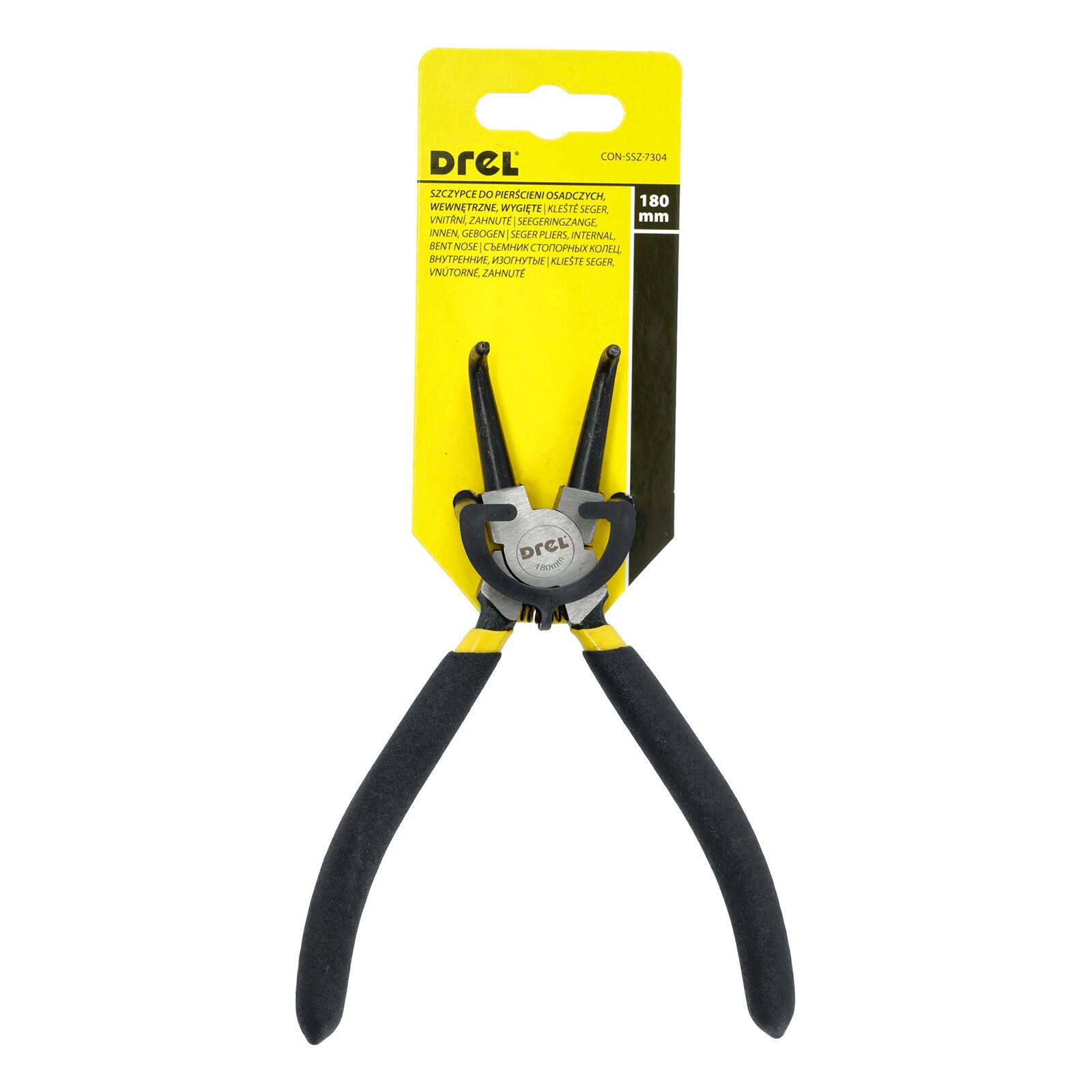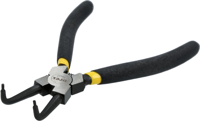 Deze interne Seegerringtang van DREL met gebogen uiteinden maakt het hanteren van borgringen in boringen en lagerschalen eenvoudiger. Dankzij de ergonomische handgrepen met antislipoppervlak en veerassistentie voert u precies werk uit, zelfs op krappe plaatsen, zonder extra moeite.