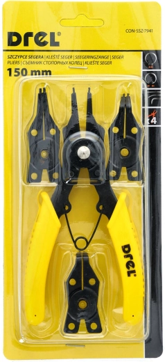 Universele DREL-seegerringtang van 150 mm voor precies en comfortabel werken. Dankzij de verwisselbare bekken kan hij zowel interne als externe seegerringen aan en biedt hij snelle wissel van bekken en een ergonomische handgreep voor een veilige grip.