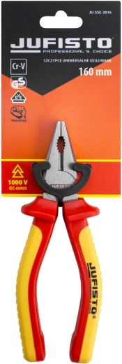 Professionele combinatietang van 160 mm met VDE/GS-certificering voor werkzaamheden tot 1000 V. Voorzien van harde en precieze snijkanten 58–62 HRC, een duurzame chroom-vanadiumstalen body 60CrV en een comfortabele tweekleurige TPE-handgreep geschikt voor veeleisende omstandigheden.