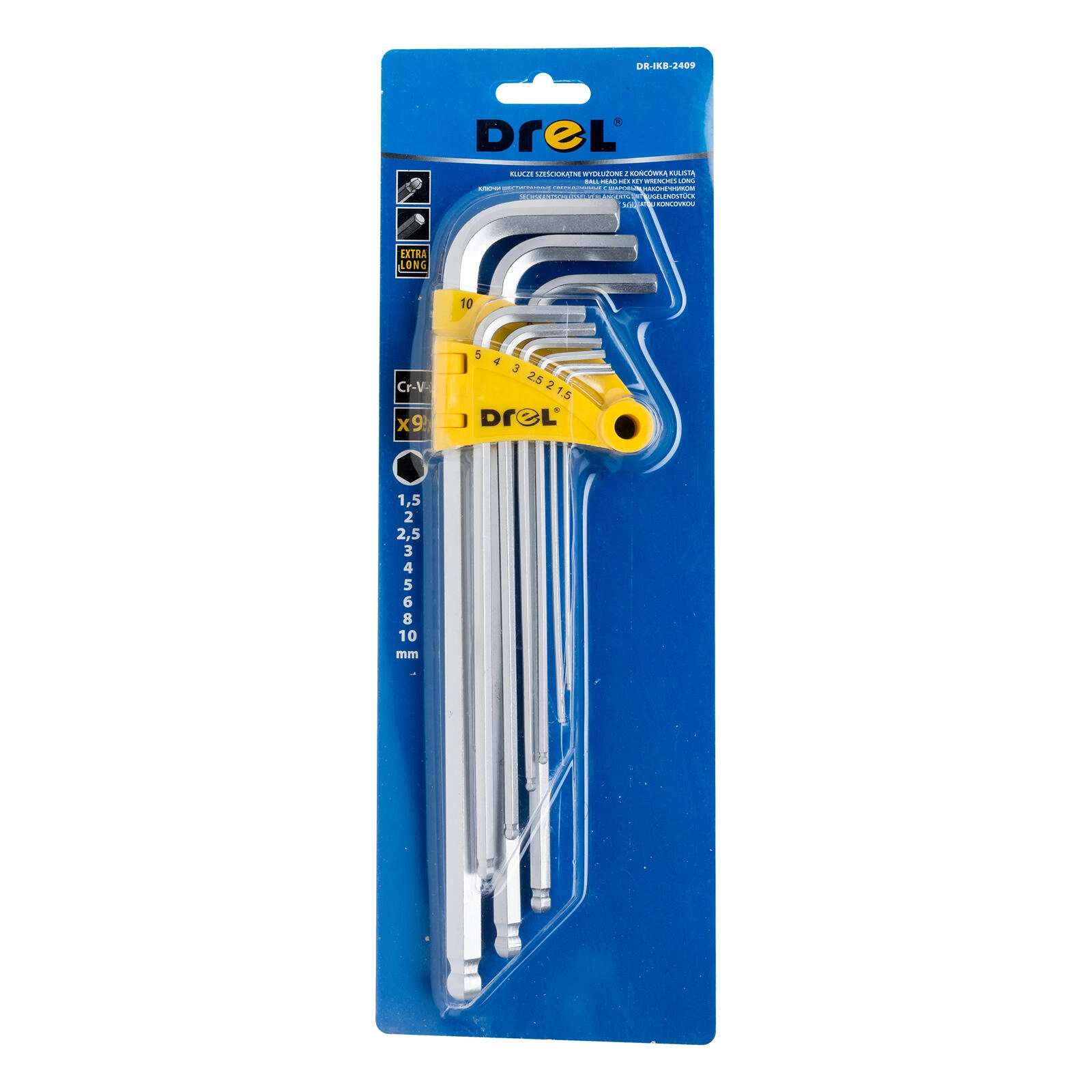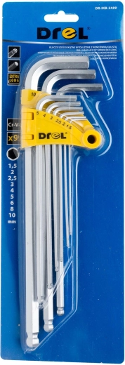 De DREL inbussleutelset is een betrouwbare keuze voor werkplaats, service en huishouden. De verlengde uitvoering en de kogelkop aan het lange uiteinde maken werken mogelijk op moeilijk bereikbare plaatsen en onder een lichte hoek. Het hoogwaardige chroom-vanadiumstaal zorgt voor een hoge slijtvastheid en weerstand tegen torsiebelasting.