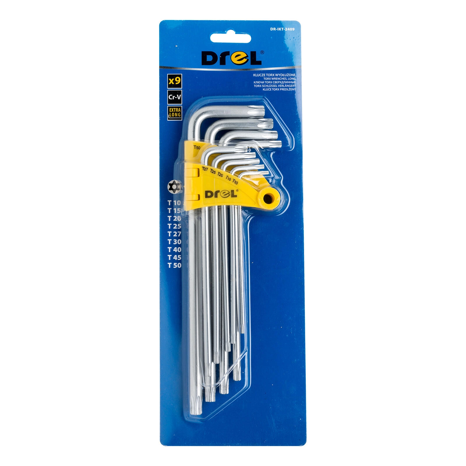 De set verlengde TORX-sleutels van DREL is een ideale keuze voor werkplaats, service en thuisgebruik. Precisiepunten van S2-staal bieden hoge hardheid, slijtvastheid en een lange levensduur. De verlengde lengte van de sleutels vergemakkelijkt werken in ruimten met beperkte toegang.