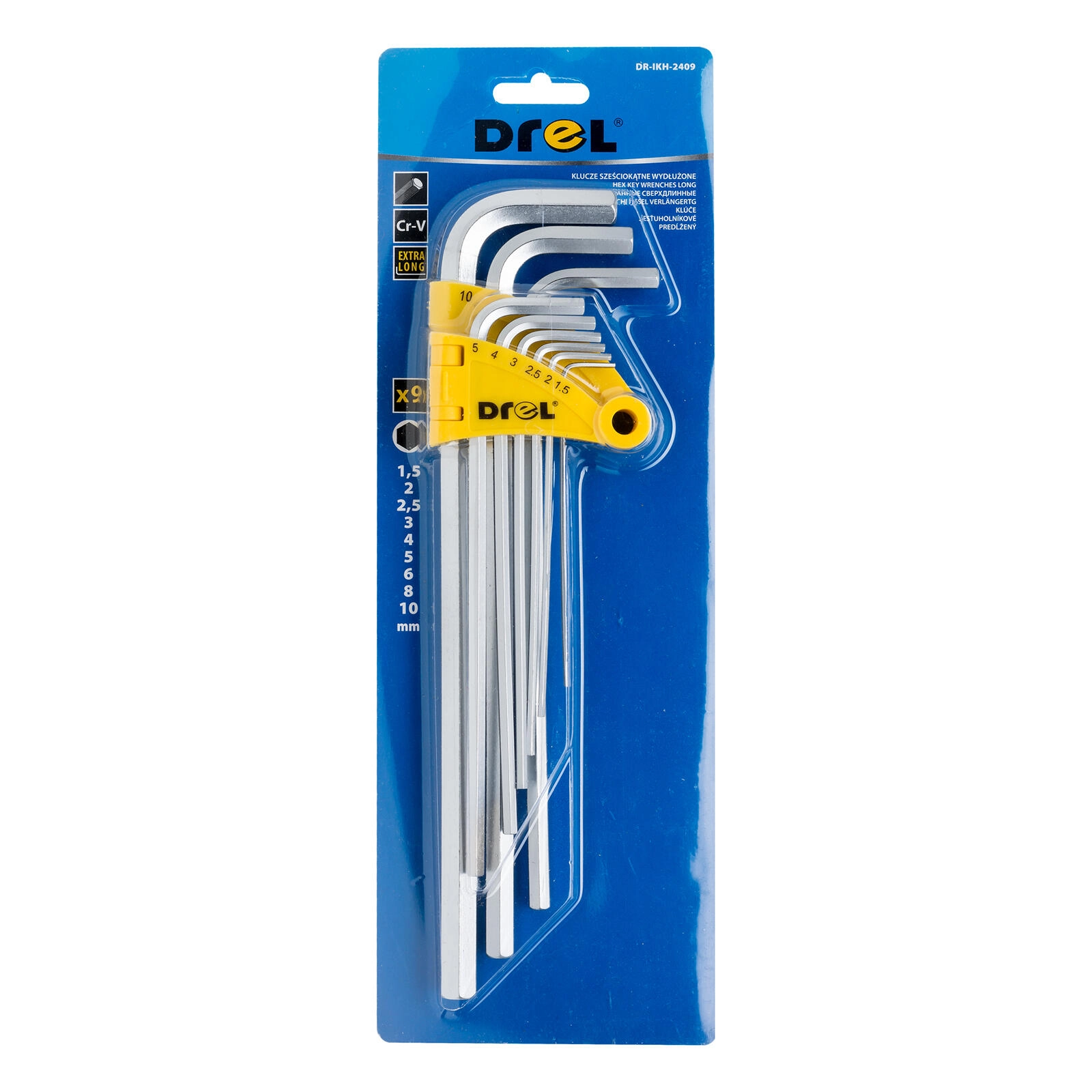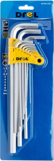 Praktische set verlengde inbussleutels van DREL met 9 maten van 1,5 tot 10 mm voor veelzijdig gebruik in werkplaats en thuis. Dankzij het materiaal van CrV-staal zijn de sleutels duurzaam en slijtvast, de kogelkop maakt comfortabel los- en vastdraaien onder een hoek mogelijk en de verlengde armen zorgen voor betere toegankelijkheid en hoger koppel.