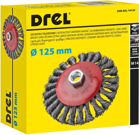 De stalen komborstel met een diameter van 125 mm is ideaal voor veeleisende reiniging van metalen oppervlakken. Robuuste getwiste draden zorgen voor hoge materiaalafname en duurzaamheid bij dagelijks gebruik. De standaard M14-schroefdraad garandeert compatibiliteit met de meeste haakse slijpers.