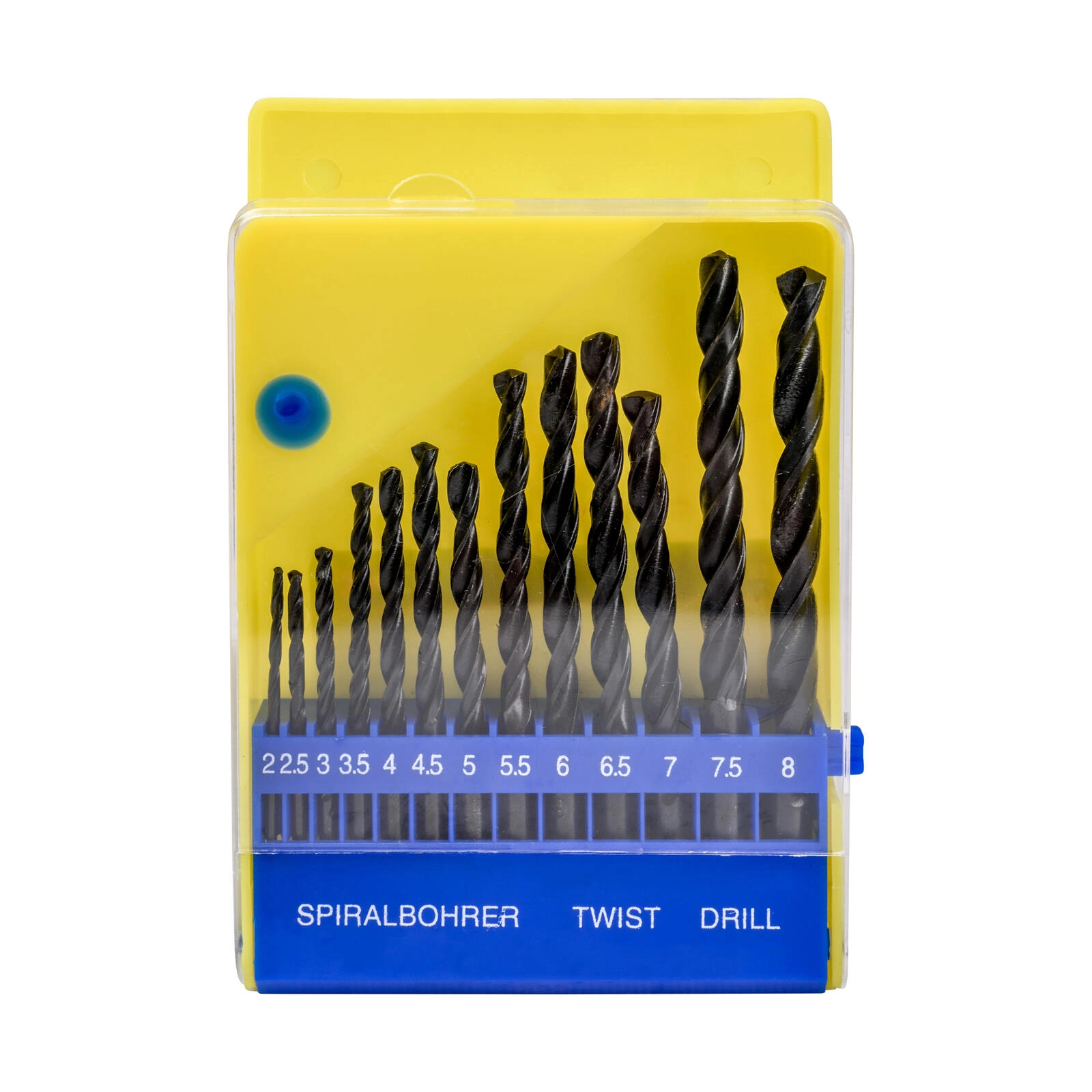 Dertien nauwkeurig oplopende diameters van 1,5 tot 8 mm dekken de meeste gangbare toepassingen. Alles overzichtelijk opgeborgen en gemarkeerd voor snelle selectie.