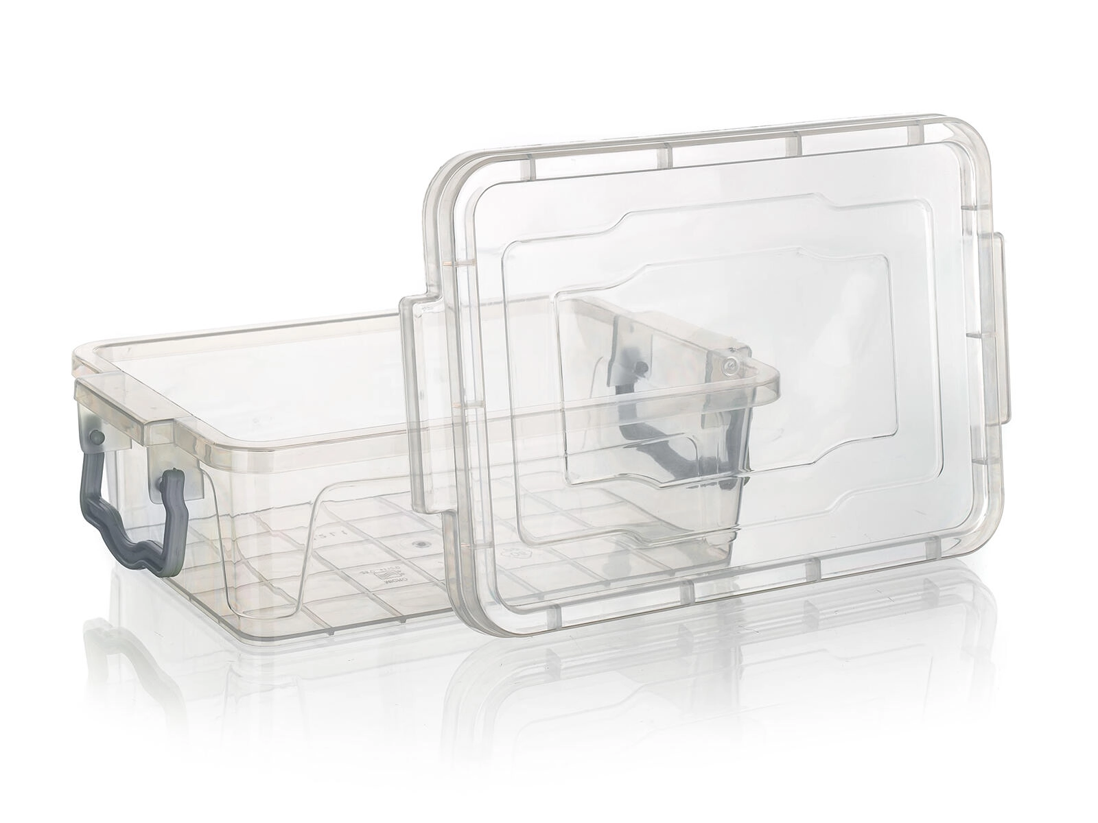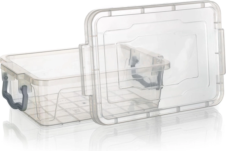 - Transparante box, turquoise handgrepen