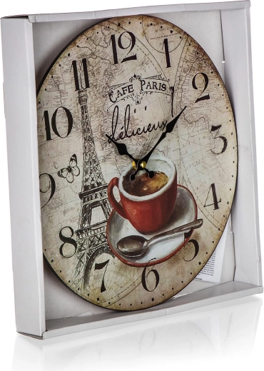 Elegante wandklok CAFE PARIS met een diameter van 34 cm geeft je interieur de stijl van een Franse café. Biedt een duidelijke wijzerplaat, full-cover decor en eenvoudige voeding met AA-batterij (niet inbegrepen). Perfect voor keuken, woonkamer en café-interieurs.