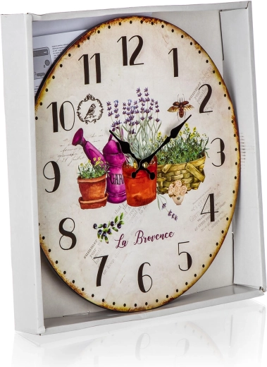 Stijlvolle wandklok met Lavender-motief die je interieur een frisse Provençaalse toets geeft. De ronde wijzerplaat met een diameter van 34 cm en het stille uurwerk op 1× AA-batterij (niet inbegrepen) garanderen een praktische én decoratieve toepassing in de woonkamer, hal of een stijlvolle keuken.