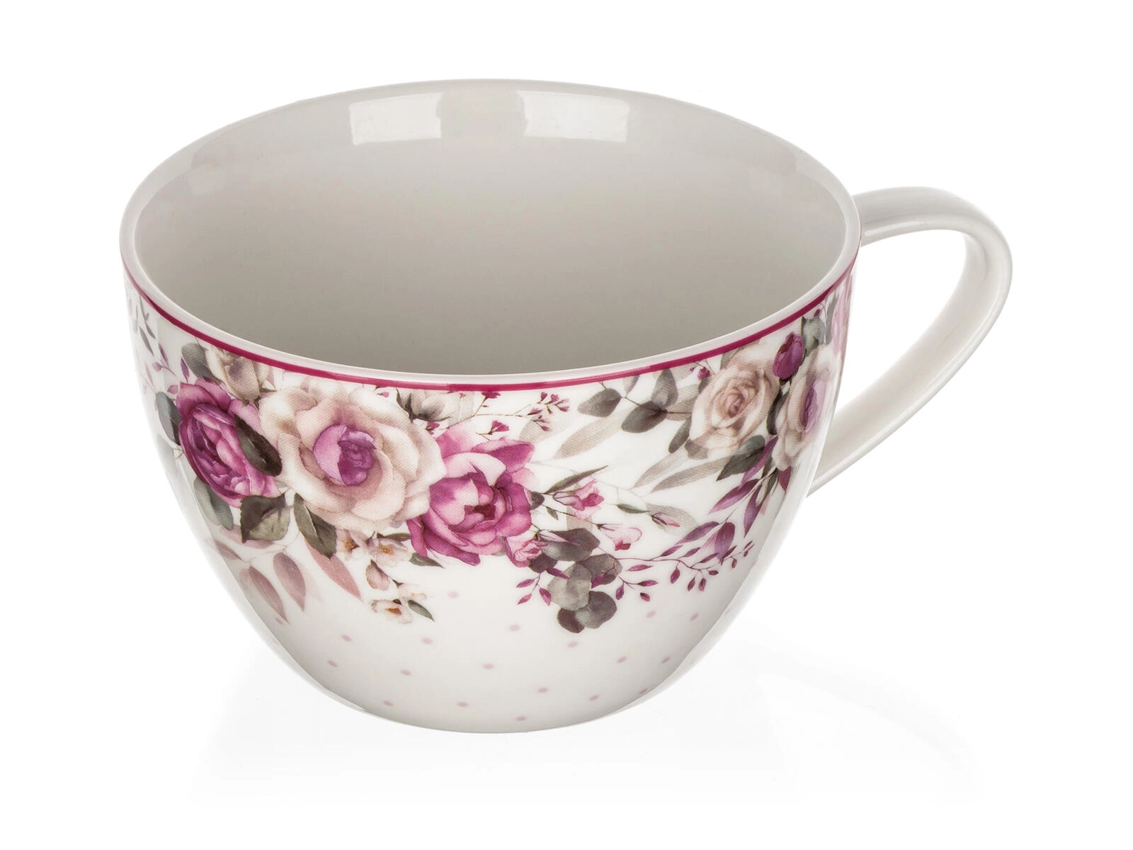 Elegante keramische mok Jumbo ROSE met een inhoud van 550 ml en een romantisch bloemenmotief, ideaal voor dagelijkse koffie of thee. Dankzij de royale capaciteit en het comfortabele oor biedt hij maximaal drinkcomfort. De mok is geschikt voor de magnetron en vaatwasserbestendig, wat dagelijks gebruik en onderhoud gemakkelijk maakt.