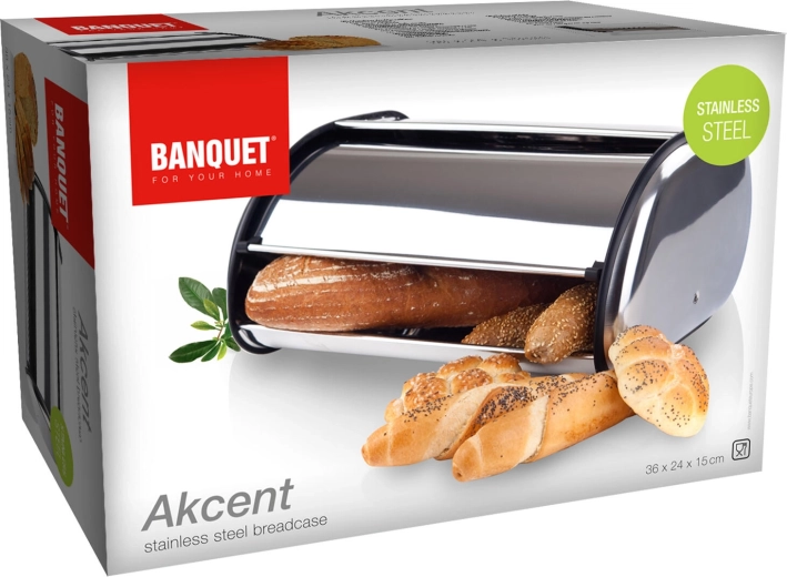 De elegante RVS broodtrommel AKCENT houdt je brood en banket langer vers. Dankzij de compacte afmetingen van 36 × 24 × 15 cm past hij op elk aanrecht, en het glanzende oppervlak geeft je keuken een moderne uitstraling. Hoogwaardige roestvast staal 201 is gemakkelijk te onderhouden en bestand tegen dagelijks gebruik.