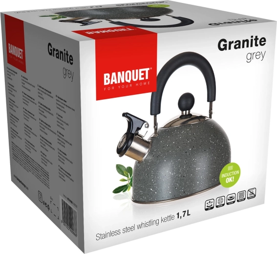 Stijlvolle theeketel met een inhoud van 1,7 l in de elegante uitvoering Granite Grey, die duurzaam roestvrij staal combineert met comfortabel gebruik. Dankzij de ingebouwde fluit wordt het kookpunt veilig aangekondigd, het ergonomische neerklapbare handvat vergemakkelijkt het schenken en de compatibiliteit met alle soorten kookplaten, inclusief inductie zorgt voor een veelzijdig gebruik in elke keuken.