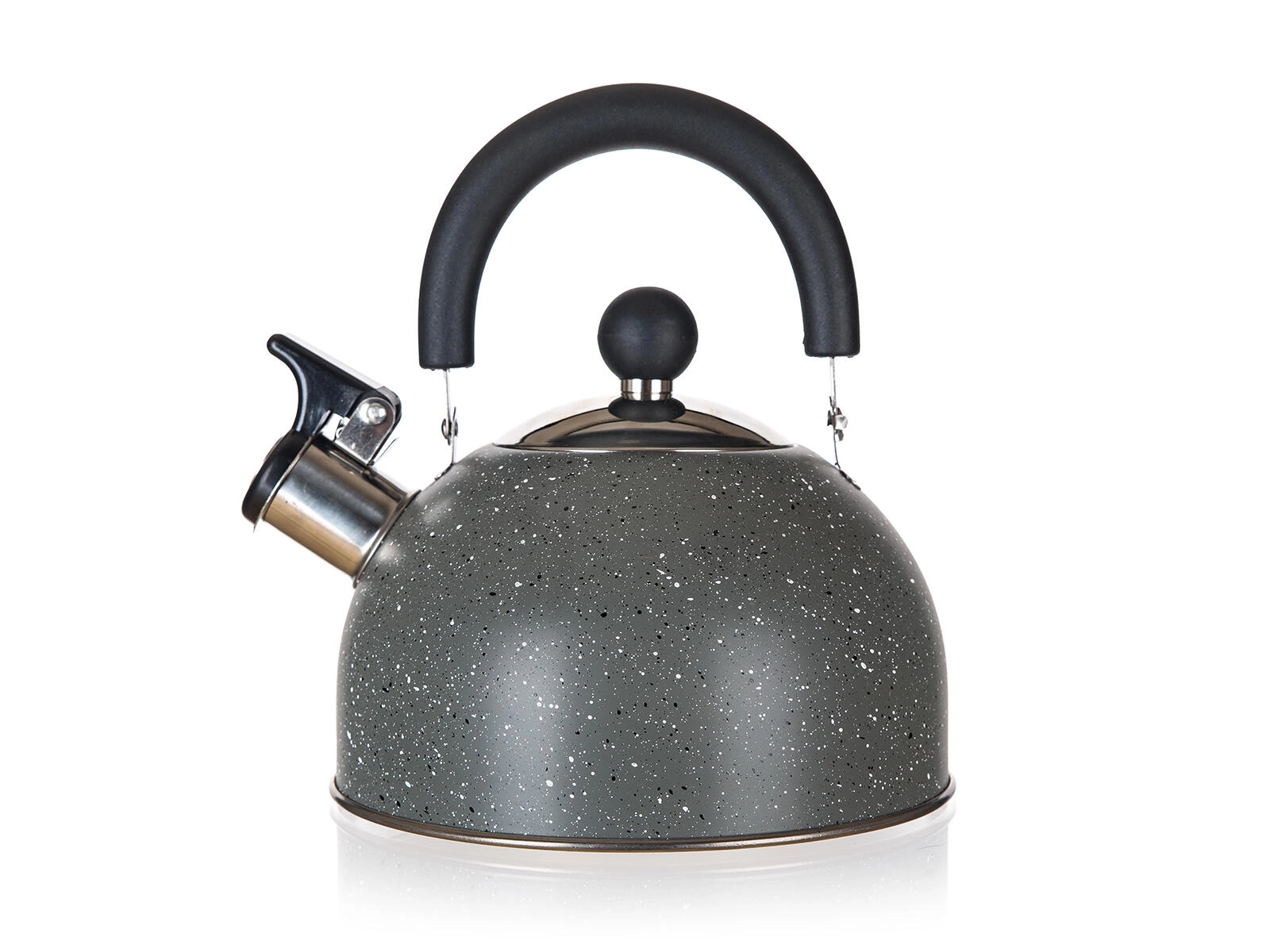 De ketel is uitgerust met een fluit voor akoestische signalering van het kookpunt en een neerklapbare kunststof handgreep voor veilig en comfortabel schenken. De brede basis ondersteunt gelijkmatige verwarming en de ketel is geschikt voor gas, elektrisch, keramisch en inductie.