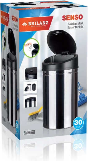 Moderne touchloze prullenbak SENZO met een inhoud van 30 l in elegant roestvrij staal voor een schonere en comfortabelere schoonmaak in huis en op kantoor. Dankzij de geïntegreerde sensor gaat het deksel automatisch open en dicht, wat zorgt voor maximale hygiëne zonder aanraking. De duurzame RVS-behuizing met een glanzend oppervlak en de uitneembare binnenemmer van kunststof vergemakkelijken het onderhoud. Voeding via 4× AA-batterijen met laag energieverbruik.