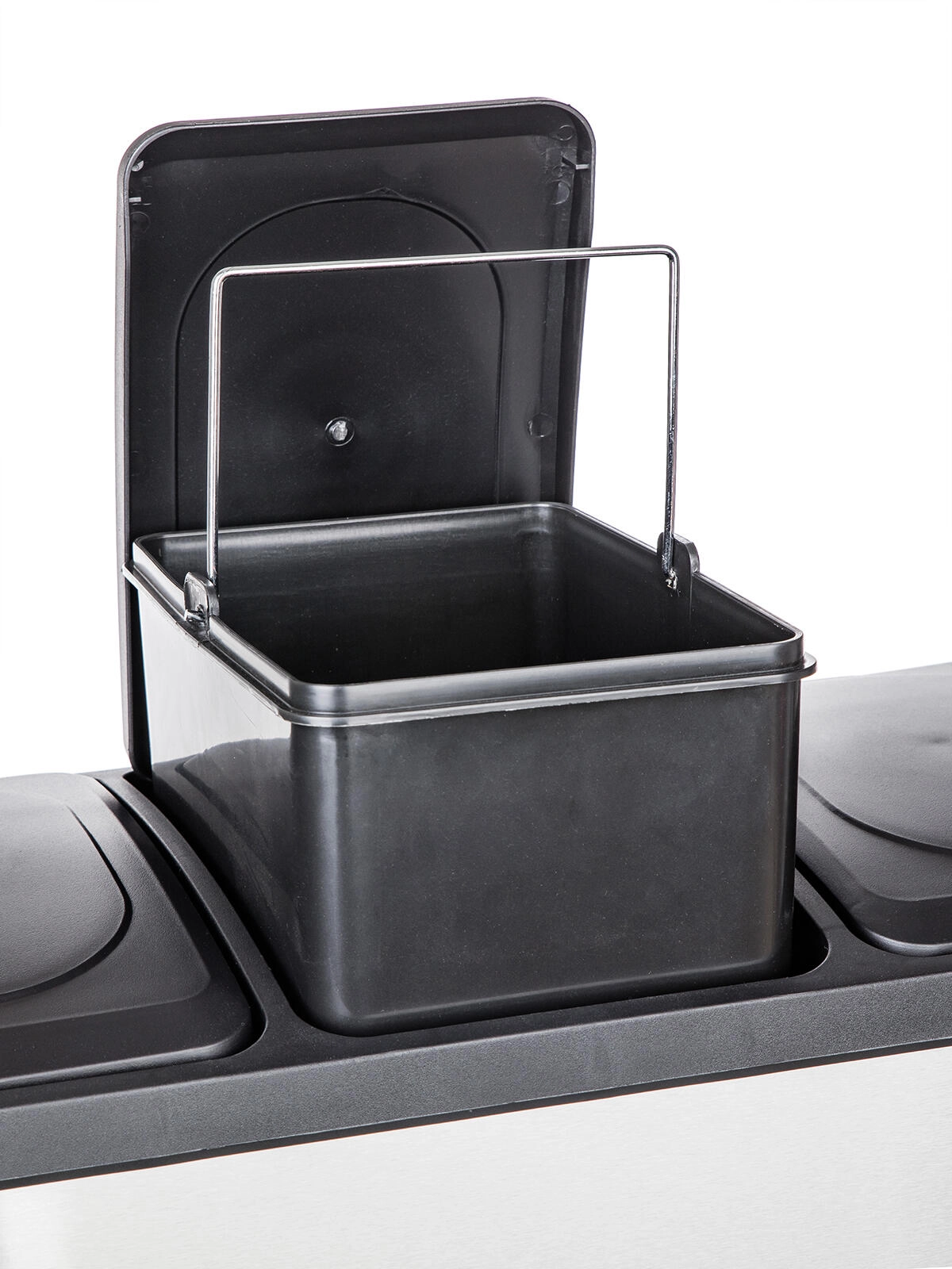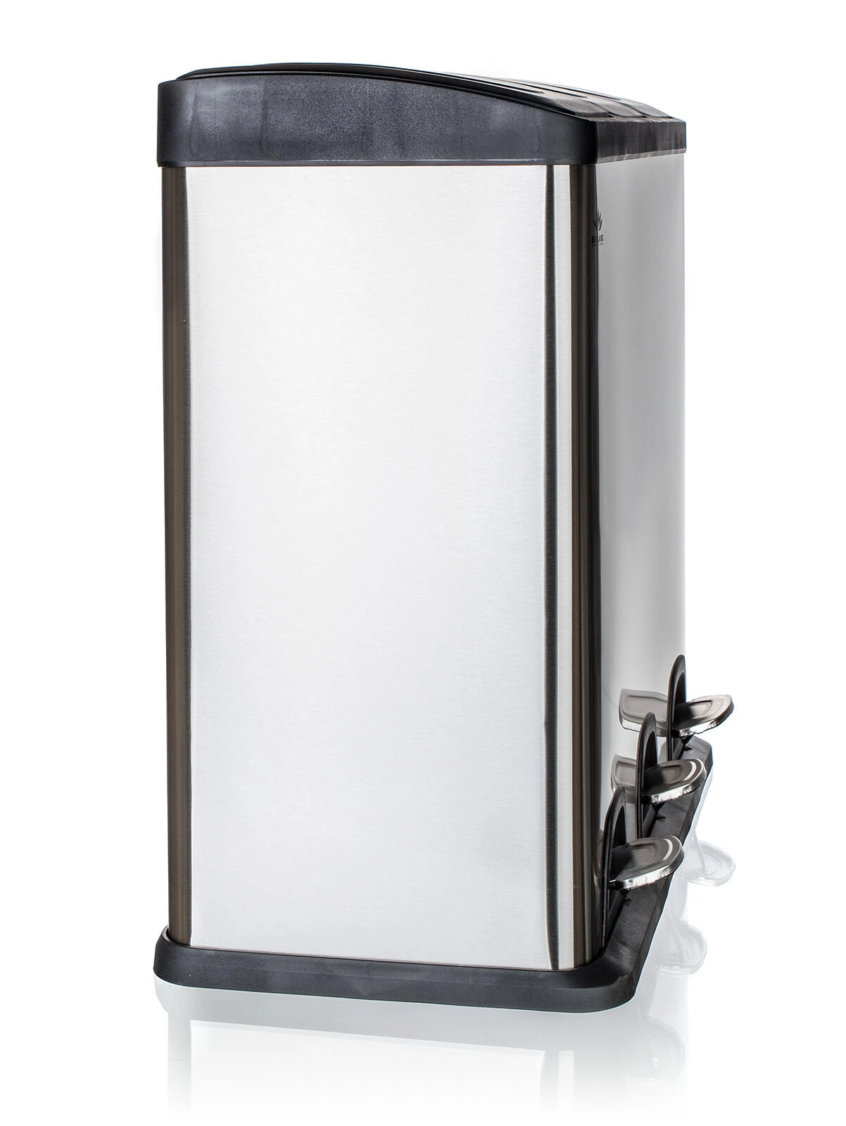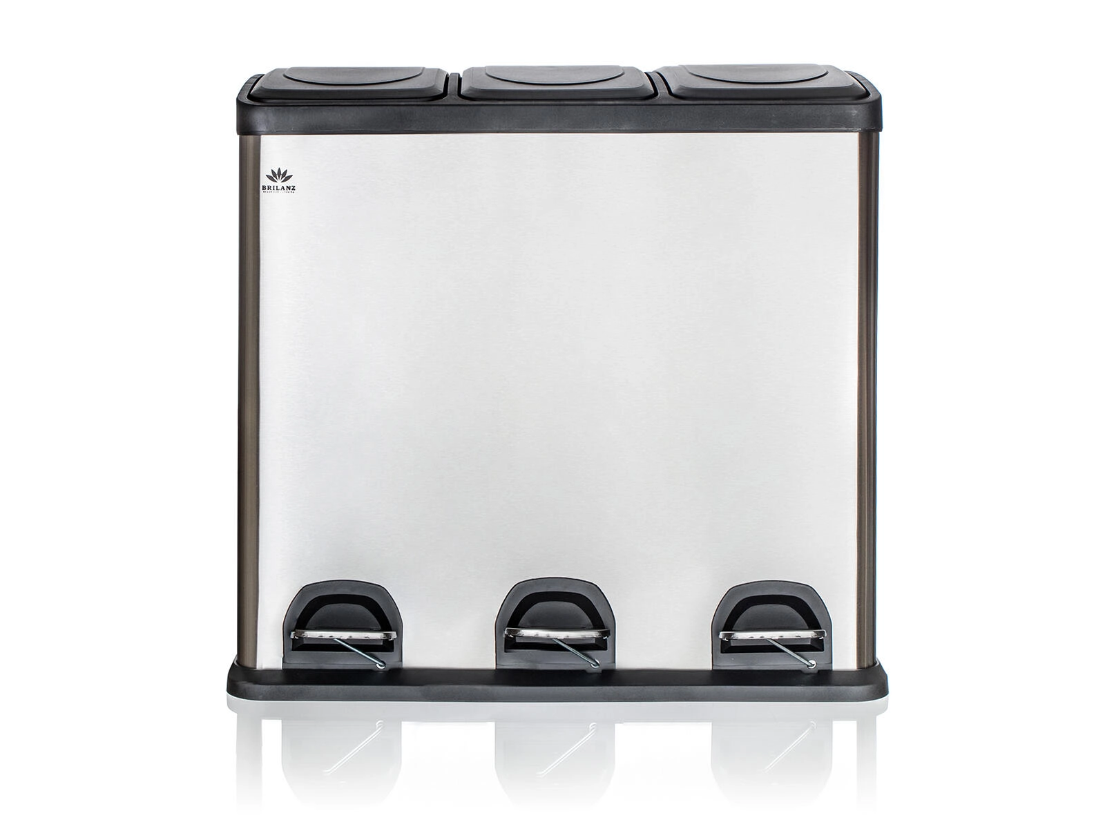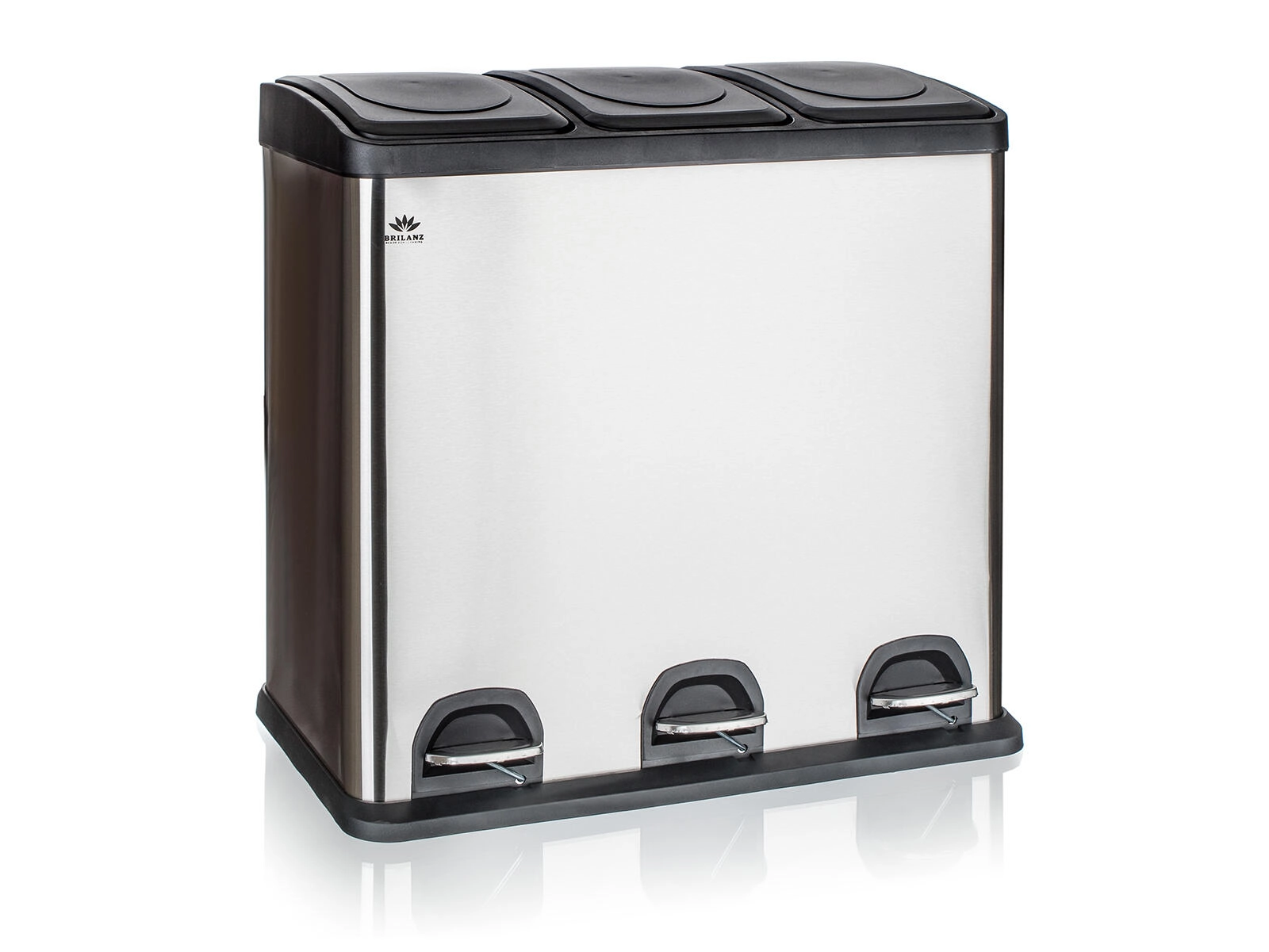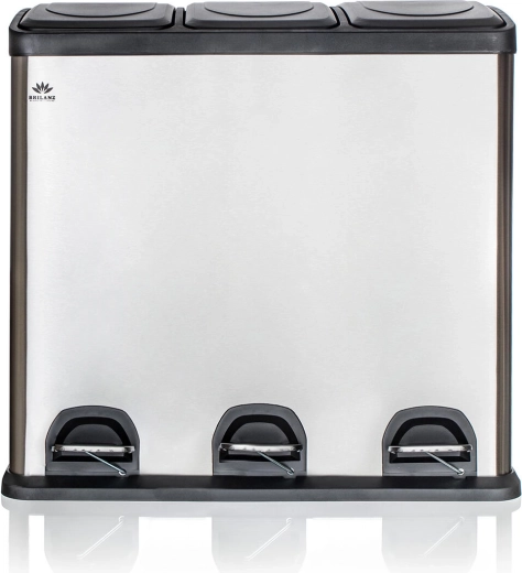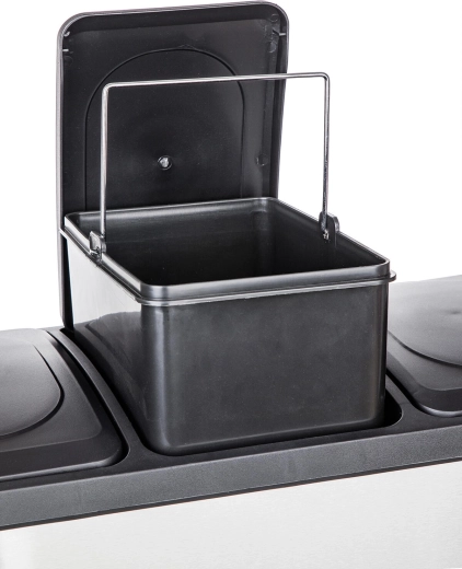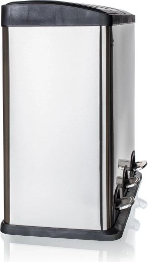 Deze elegante bak, een combinatie van roestvrij staal en duurzaam kunststof, biedt een overzichtelijke en schone oplossing voor afvalscheiding. Drie onafhankelijke pedalen bedienen afzonderlijke deksels, zodat je alleen het compartiment opent dat je nodig hebt – zonder handcontact en met minimale geuroverlast.