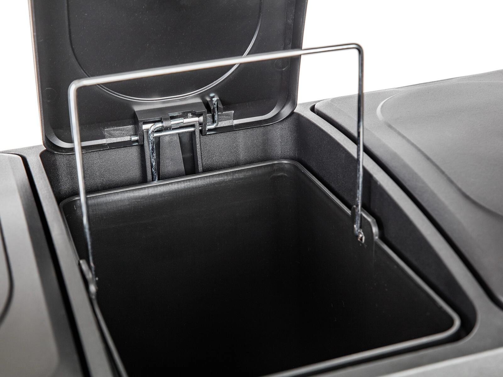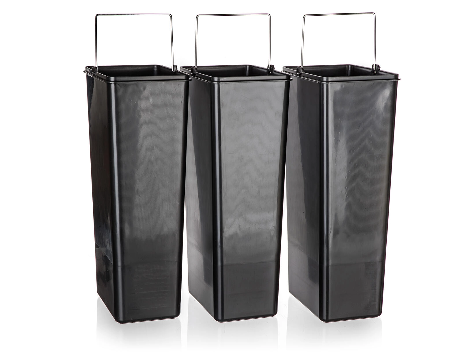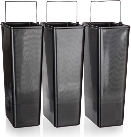 Elk compartiment heeft een eigen uitneembare binnenbak met handgreep, waardoor het vervangen van zakken en reinigen snel en netjes verloopt. Het slanke, rechthoekige ontwerp bespaart ruimte en staat ideaal tegen een muur of in een keukenhoek.