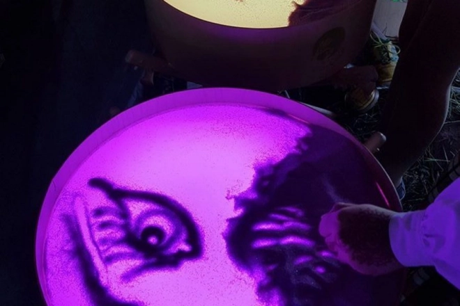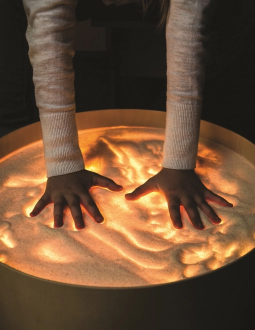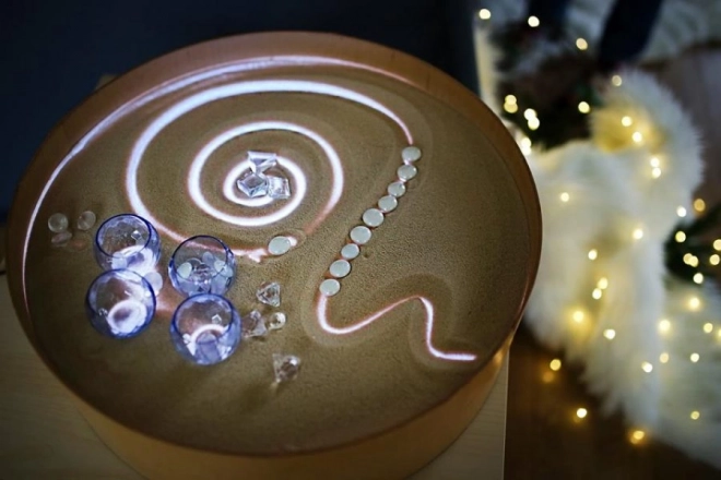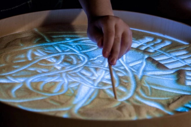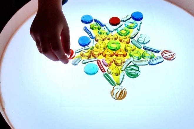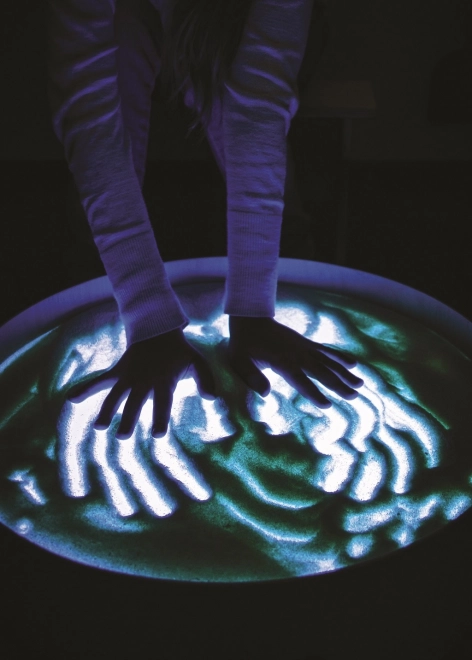 Op het blad kun je tekenen met vingers, kwasten en kunststof tools, werken met zand, steentjes en andere materialen zonder rommel dankzij de verhoogde rand. De tafel dient ook als lichtscène voor een klein theater, decoratieve verlichting in de kinderkamer of als therapeutisch hulpmiddel voor de ontwikkeling van kleurwaarneming, vormen en patronen.