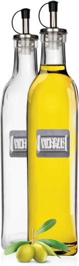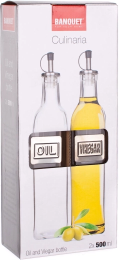 Praktische set van twee glazen flessen van 500 ml voor het bewaren en serveren van olie en azijn. Dankzij de geïntegreerde schenktuit, de kunststof dop met afdichting en het hoekige ontwerp doseer je eenvoudig, sluit het uitstekend af en staat het elegant in elke keuken.