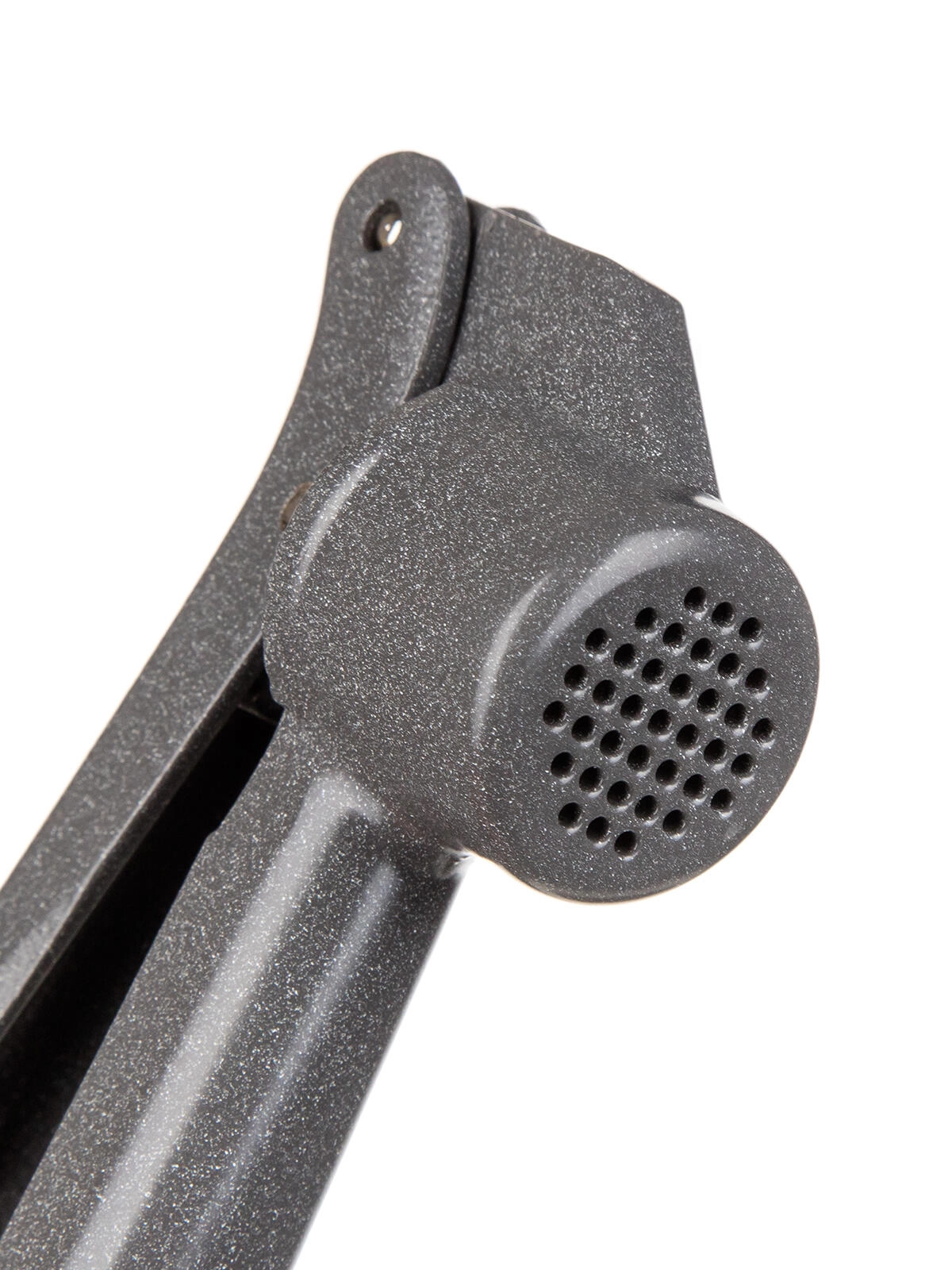 Praktische knoflookpers van duurzame aluminiumlegering in een elegante grijze kleur voor snel en efficiënt pletten van knoflook zonder moeite. Ergonomische handgrepen zorgen voor een comfortabele grip en een gemakkelijk te reinigen rooster bespaart tijd bij het onderhoud.