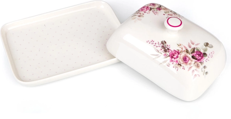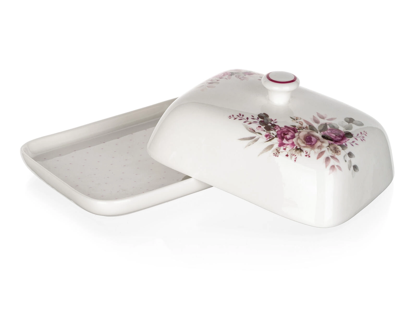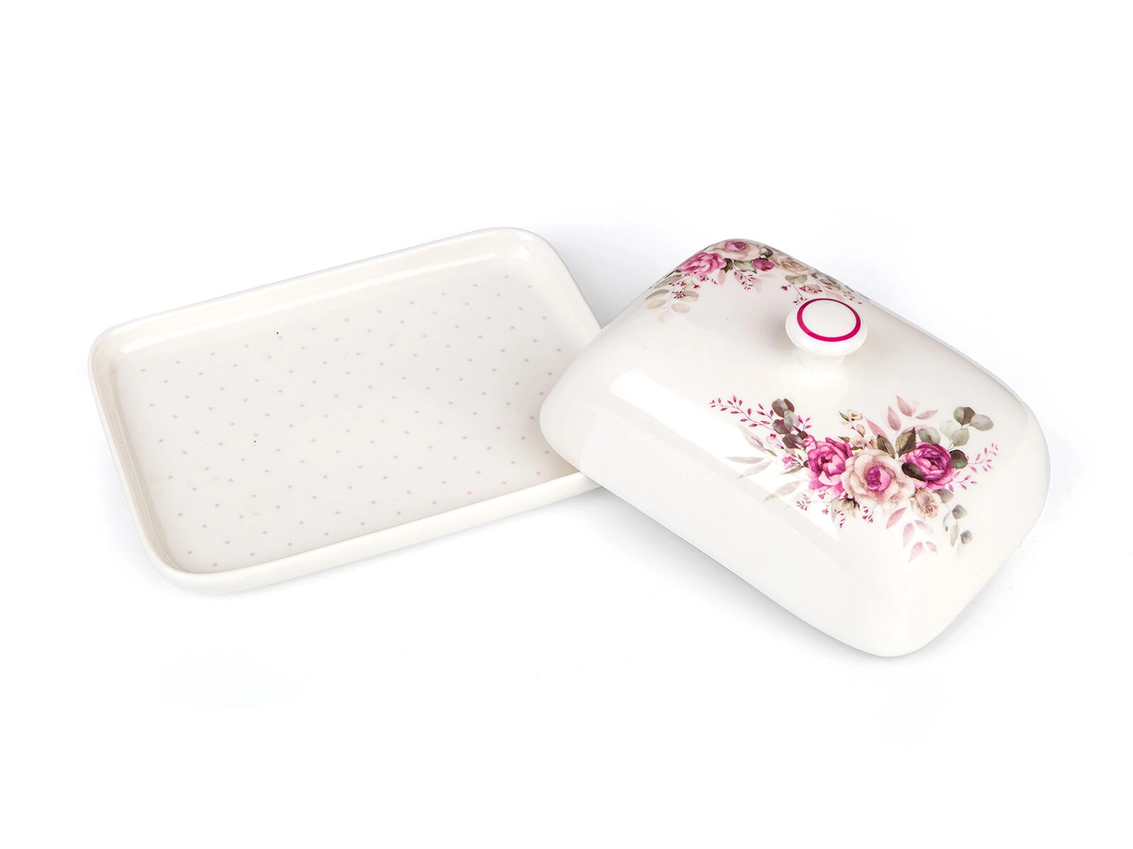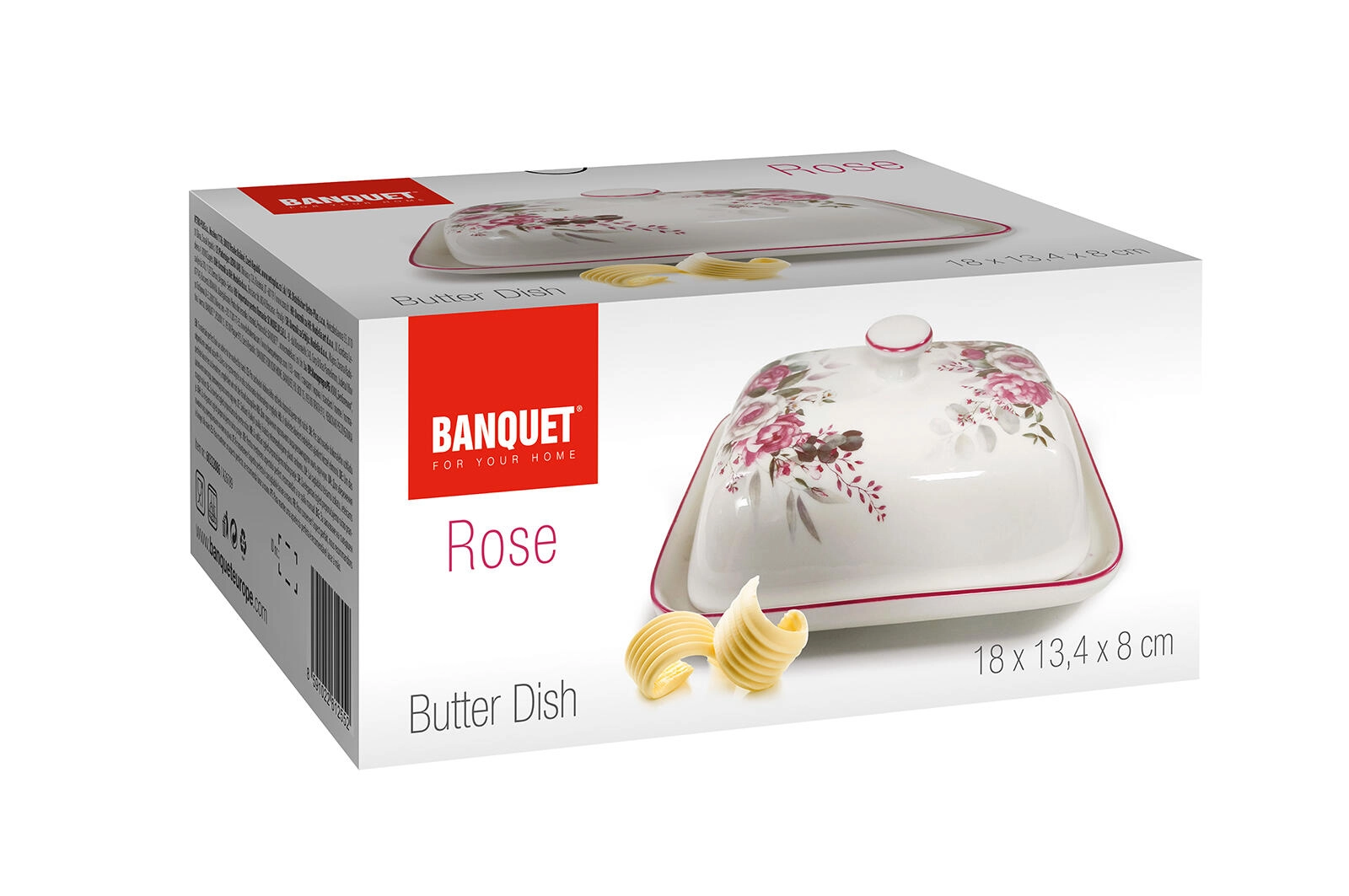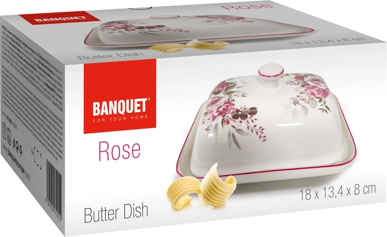 Breng tijdloze elegantie op tafel met de ROSE botervloot van hoogwaardige keramiek. Dankzij de goed sluitende deksel blijft boter beschermd tegen geuren en langer vers, terwijl het gladde glazuur het reinigen vergemakkelijkt. Het subtiele rozenmotief in pasteltinten laat zich gemakkelijk combineren met ander servies en verfraait elke presentatie.