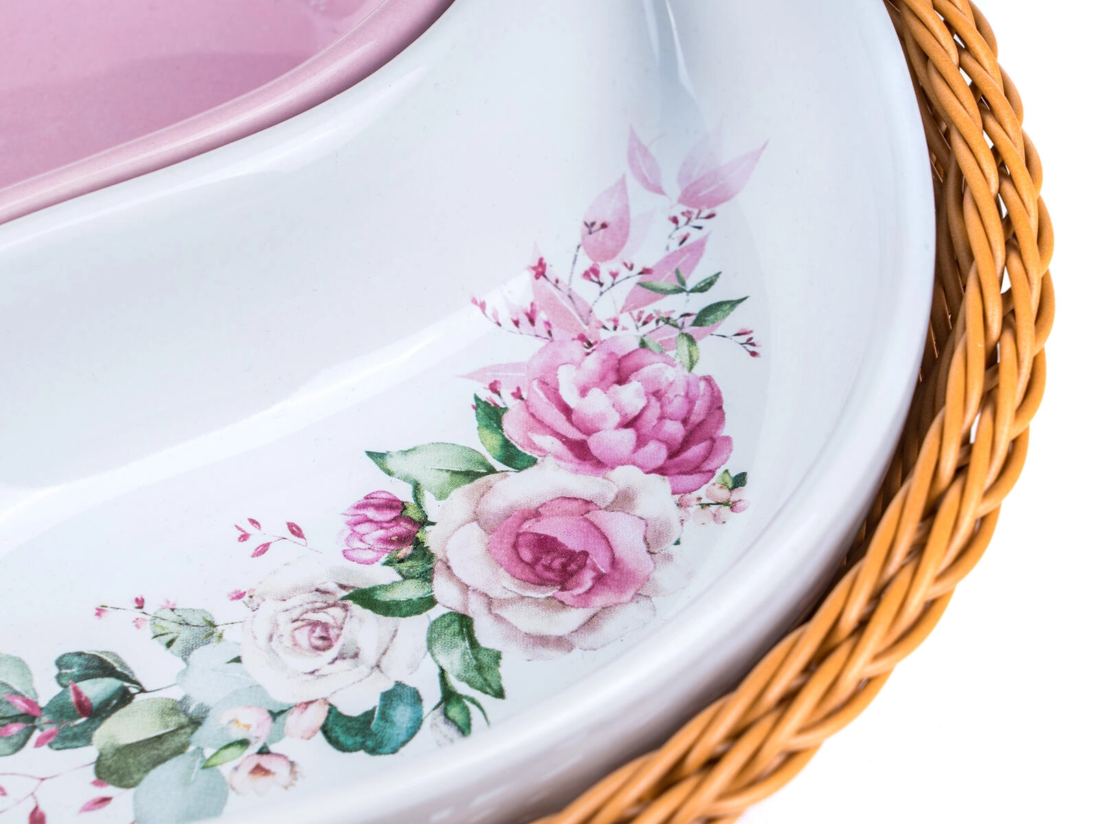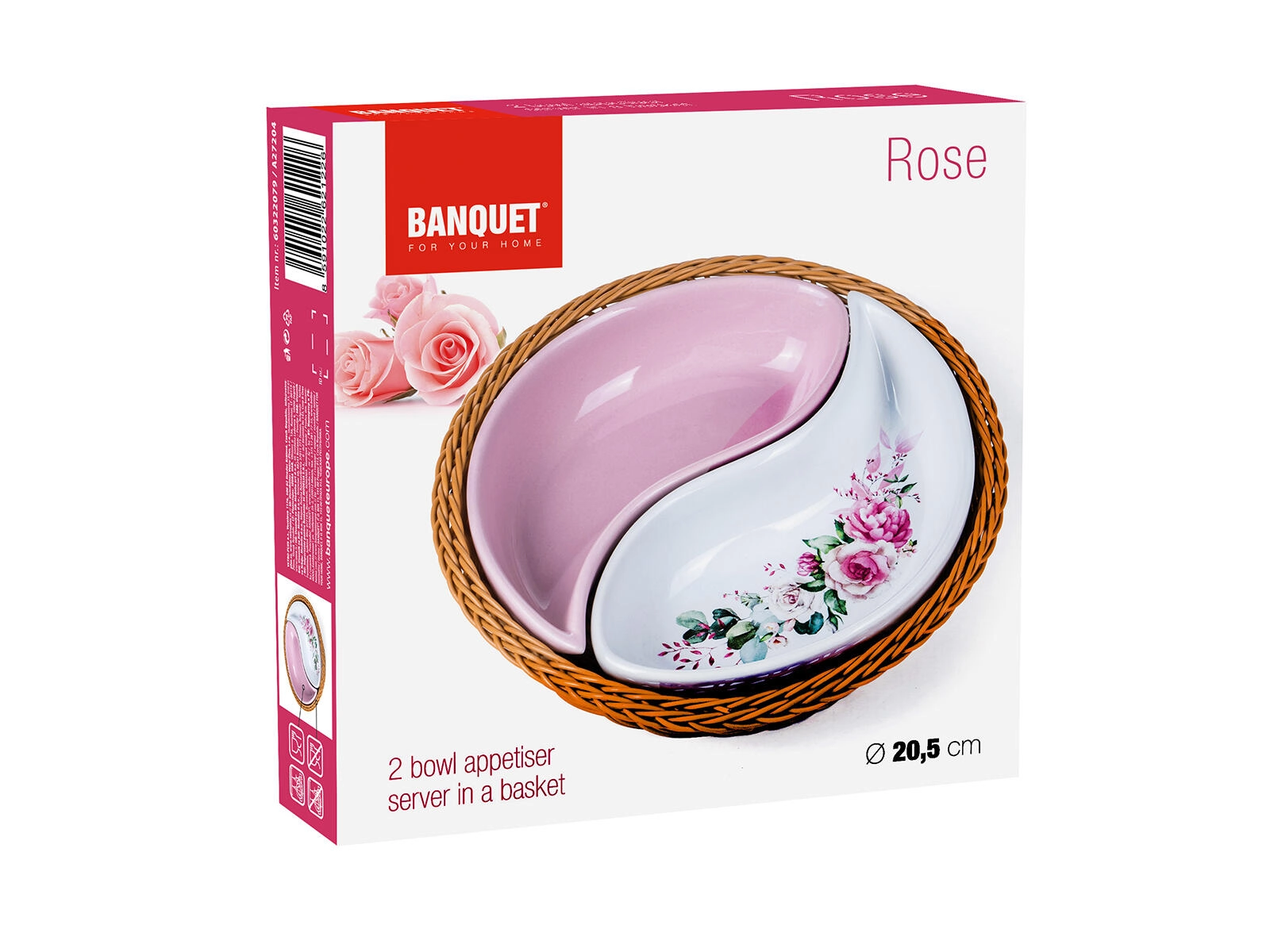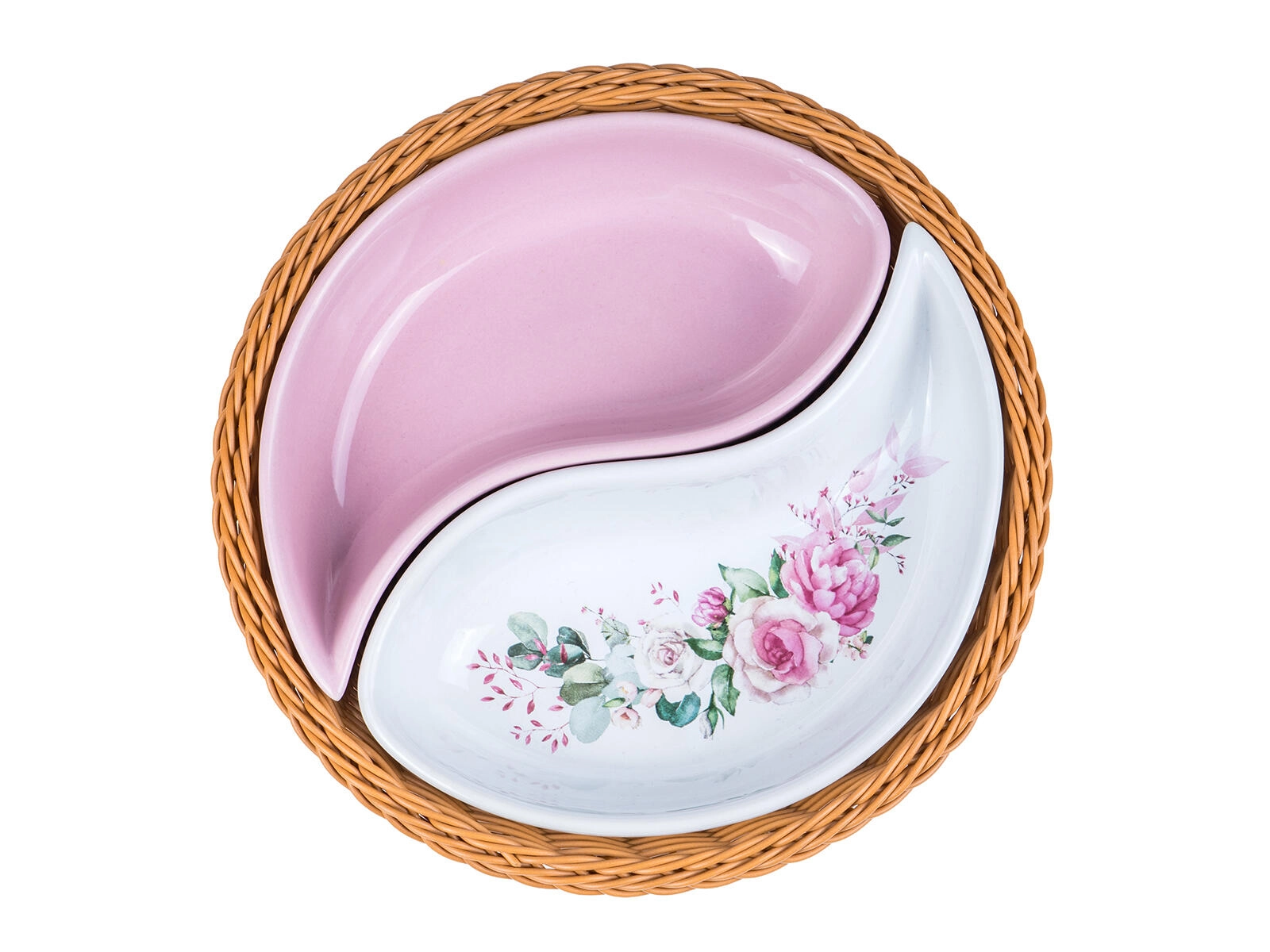 Elegante tweedelige set schaaltjes ROSE in een ronde rieten mand met een diameter van 20,5 cm, die glanzend keramiek in roze-witte glazuur combineert met een romantisch bloemendecor. Ideaal voor het serveren van snacks, nootjes, dips of bijgerechten, met een praktische gedeelde vorm en eenvoudig onderhoud.