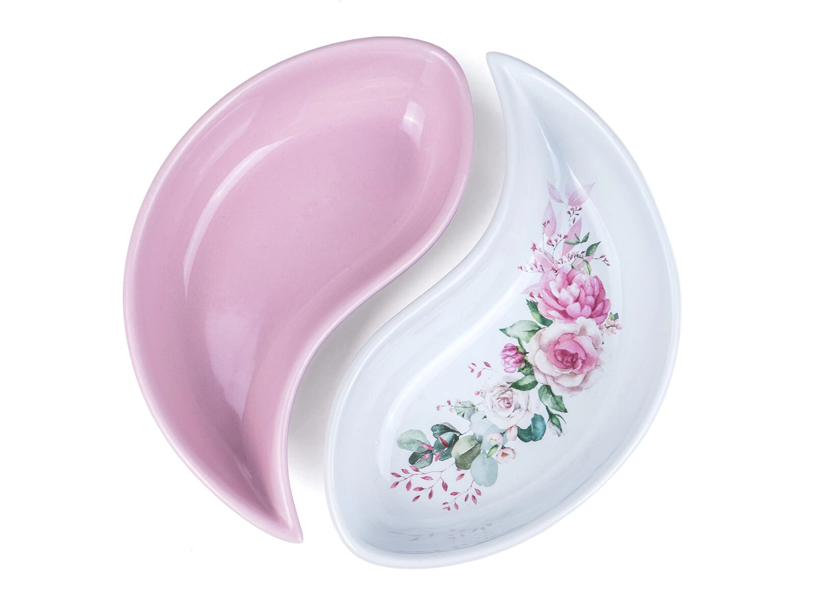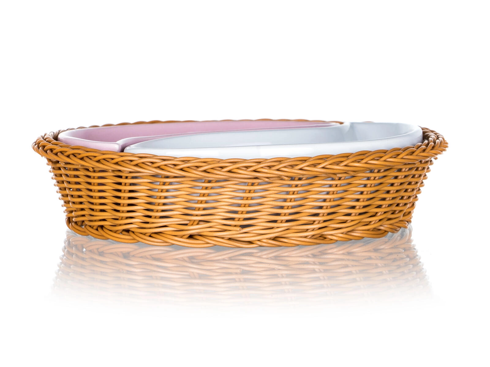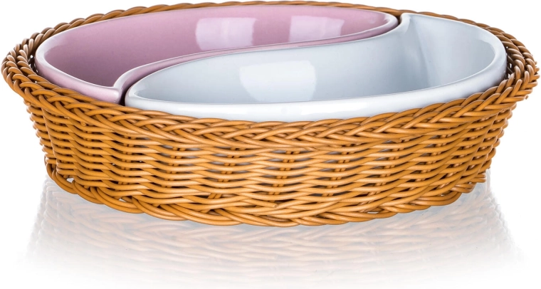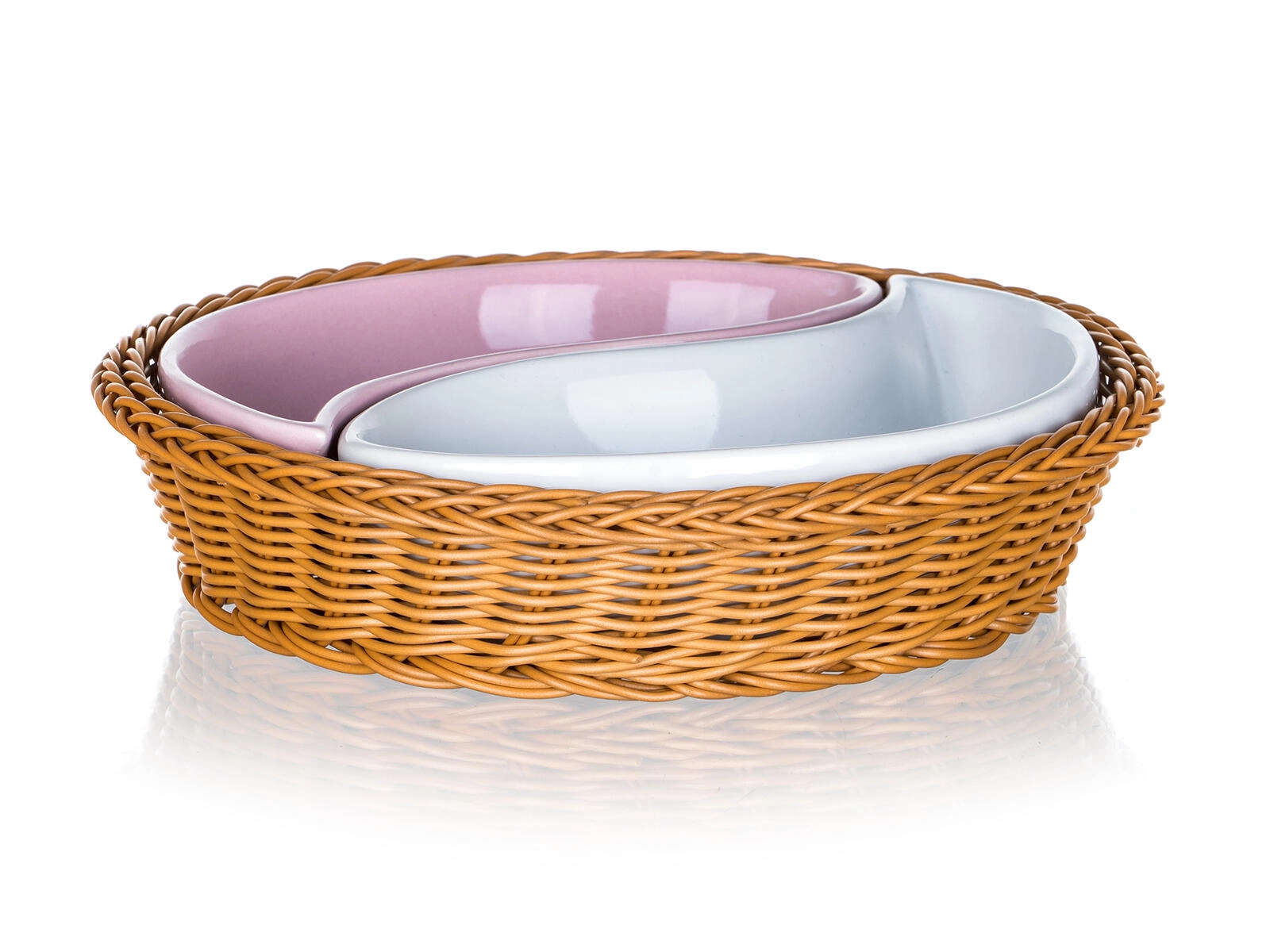 Elegante tweedelige set schaaltjes ROSE in een ronde rieten mand met een diameter van 20,5 cm, die glanzend keramiek in roze-witte glazuur combineert met een romantisch bloemendecor. Ideaal voor het serveren van snacks, nootjes, dips of bijgerechten, met een praktische gedeelde vorm en eenvoudig onderhoud.