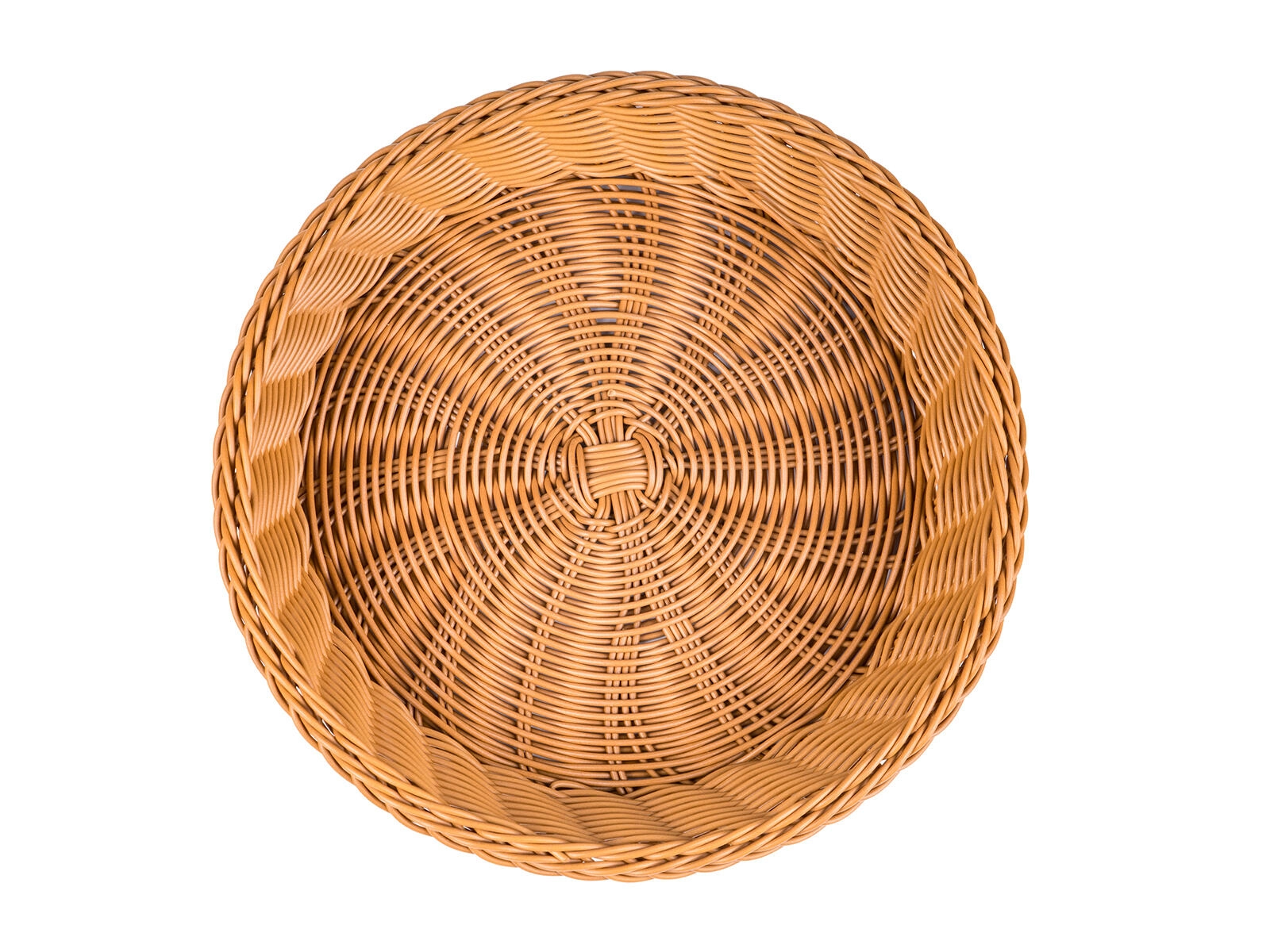 De stevige mand met rietlook dient als stabiele basis, vergemakkelijkt het hanteren en completeert de natuurlijke serveerstijl.