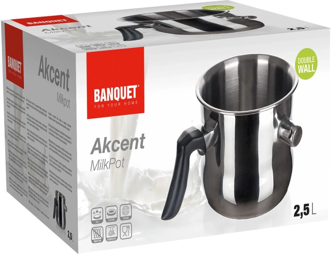 De RVS melkpan AKCENT met een inhoud van 2,5 l is ontworpen voor het zacht garen van voedingsmiddelen die snel aanbranden. De dubbelwandige constructie maakt koken au bain-marie mogelijk: in de buitenpan wordt via de opening voor het fluitje water gegoten, dat bij het bereiken van het kookpunt akoestisch waarschuwt. Zo kook je gecontroleerd en gelijkmatig.