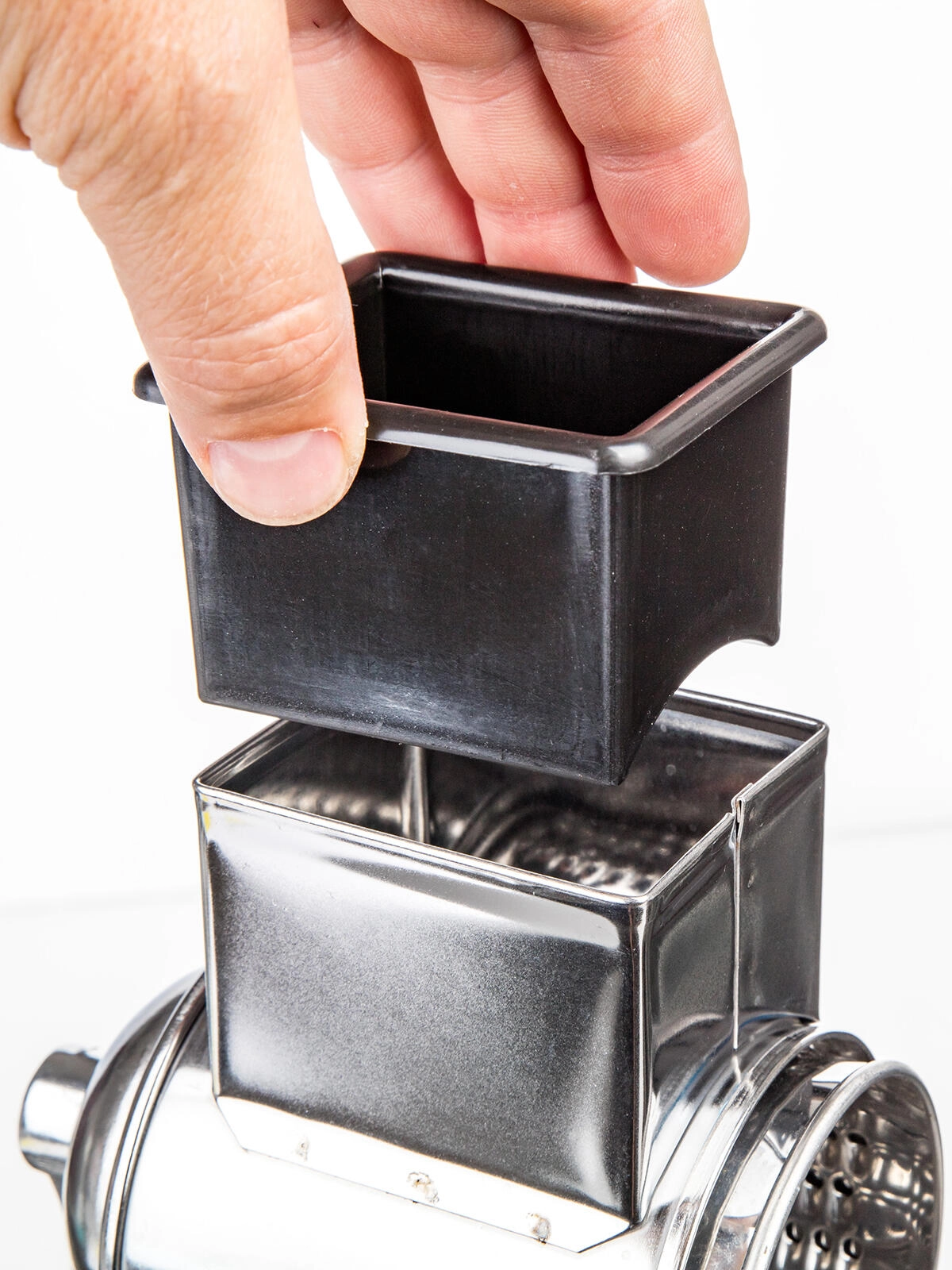 De hoogwaardige trommel van roestvrij staal zorgt voor efficiënt malen van paneermeel, noten en harde kazen met een lange levensduur.
