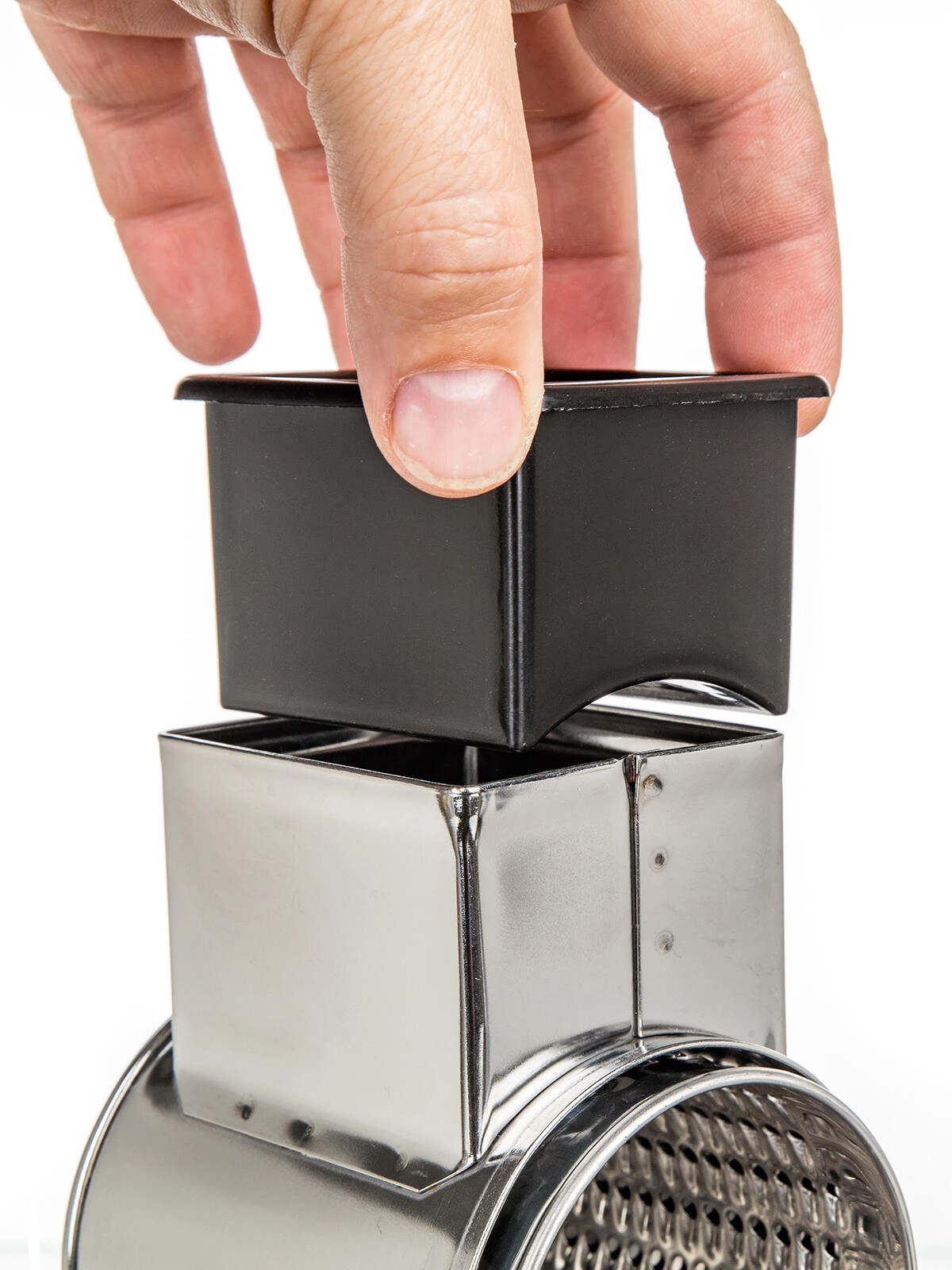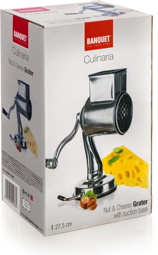 De roestvrijstalen CULINARIA-molen combineert een robuuste constructie met eenvoudige bediening. De cilindrische trommel van hoogwaardig roestvrij staal zorgt voor gelijkmatig malen en raspen van brood, noten en harde kazen, terwijl de meegeleverde stamper veilige geleiding van de ingrediënten mogelijk maakt zonder risico op verwondingen.