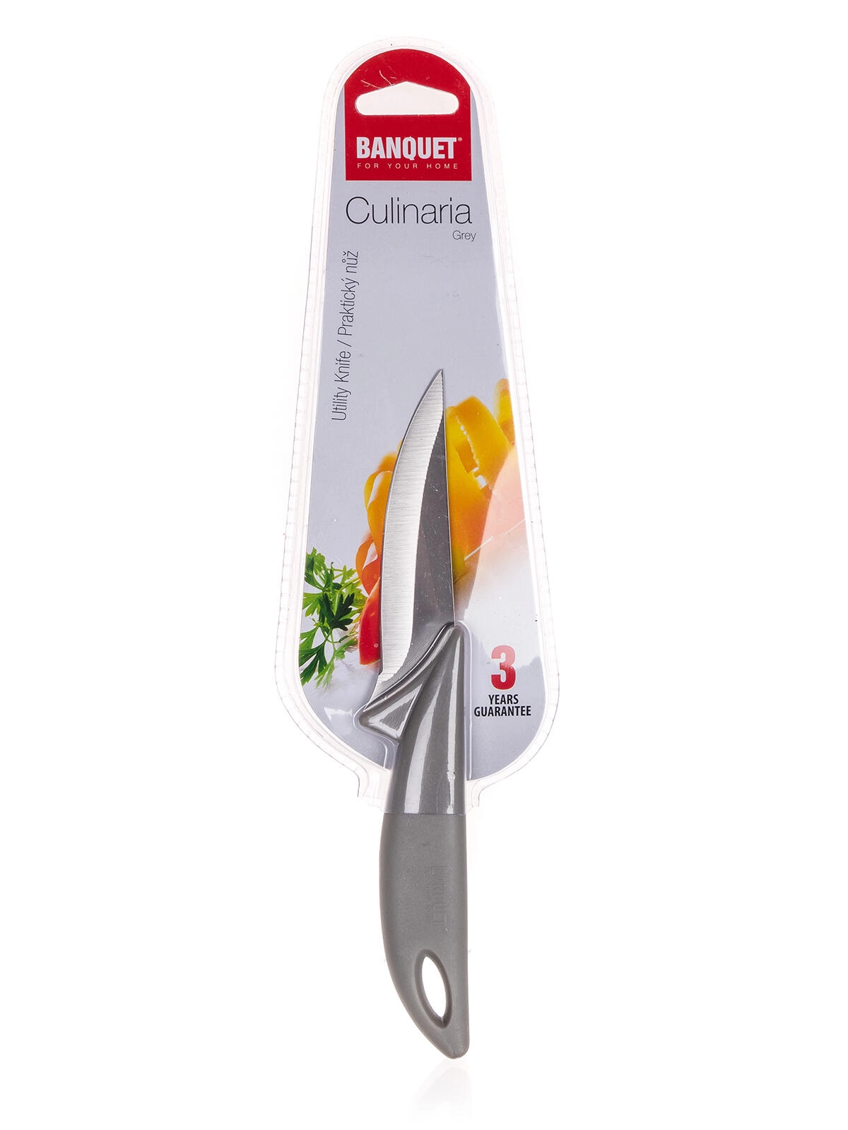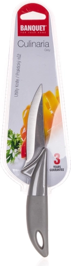 Het CULINARIA Grey mes is ontworpen voor veelzijdig gebruik in de alledaagse keuken. Het 9 cm stalen lemmet zorgt voor precieze en schone sneden, terwijl de lichte en comfortabele grip dankzij het kunststof handvat vermoeidheid tijdens het werk vermindert. Dankzij de compacte afmetingen is het perfect voor het schillen, snijden van fruit en groenten en fijn portioneren.