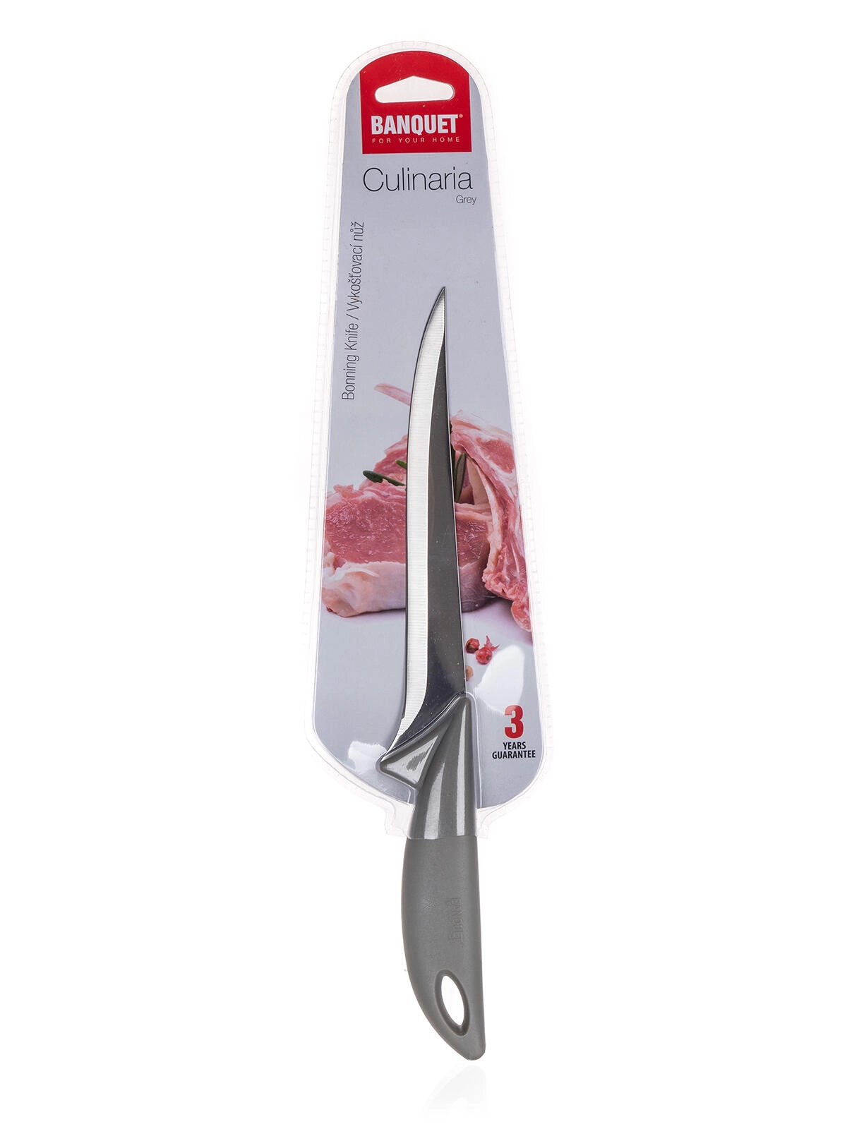 Praktisch uitbeenmes met een lemmetlengte van 18 cm uit de collectie CULINARIA Grey, ideaal voor het precies losmaken van vlees van de botten. Het stalen lemmet zorgt voor een zuivere snede en lange levensduur, terwijl het ergonomische handvat van kunststof een zekere grip en comfortabel werken in de keuken biedt.