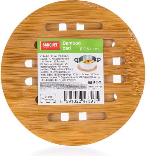 Bamboe onderzetter BRILLANTE met een diameter van 17,5 cm beschermt betrouwbaar de tafel en het aanrecht tegen hitte en krassen. Gemaakt van duurzaam bamboe, met een hoogte van 1 cm voor betere isolatie en geschikt voor warme en koude gerechten en dranken.