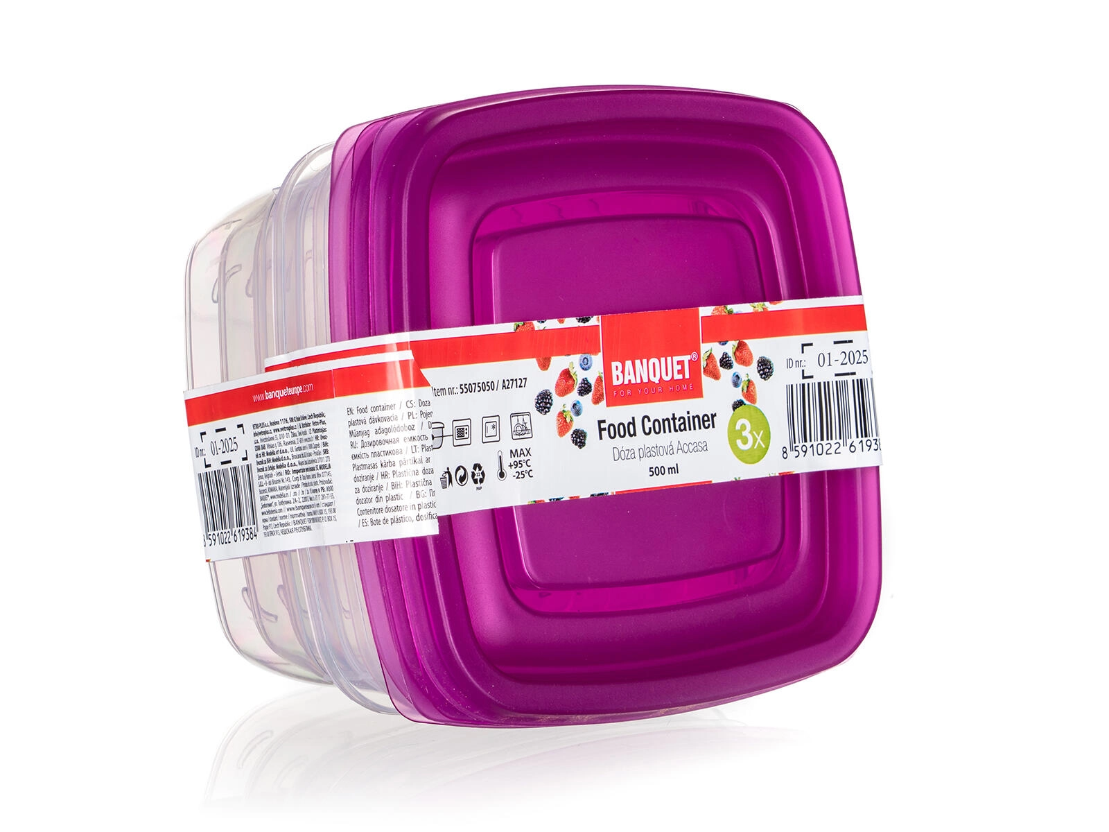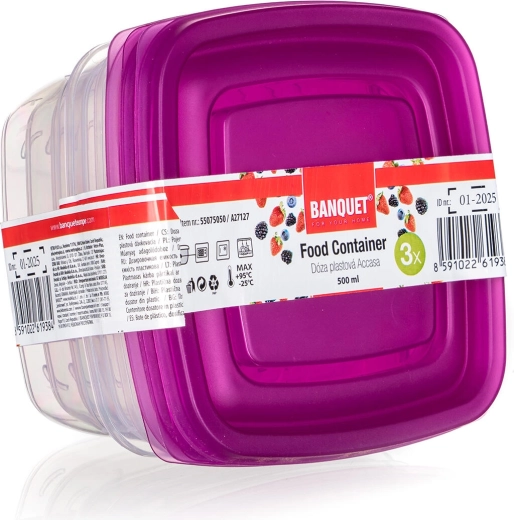 Set van vierkante voedseldozen 0,5 l met paars deksel (3 stuks) ACCASA