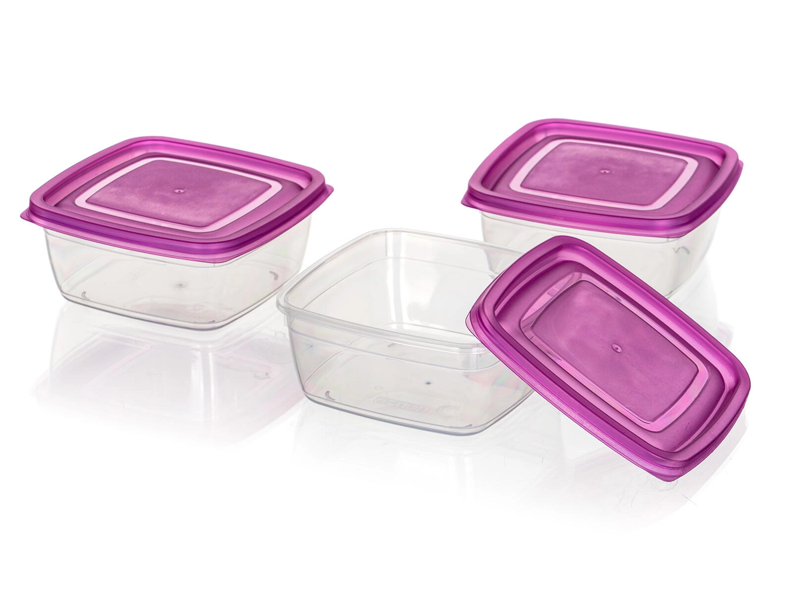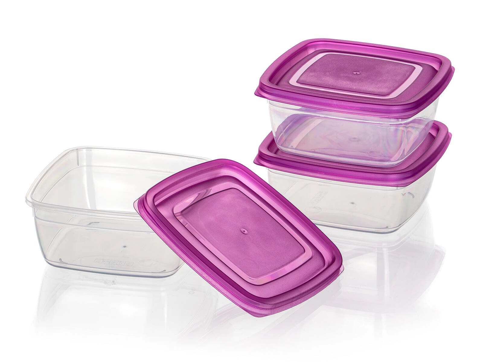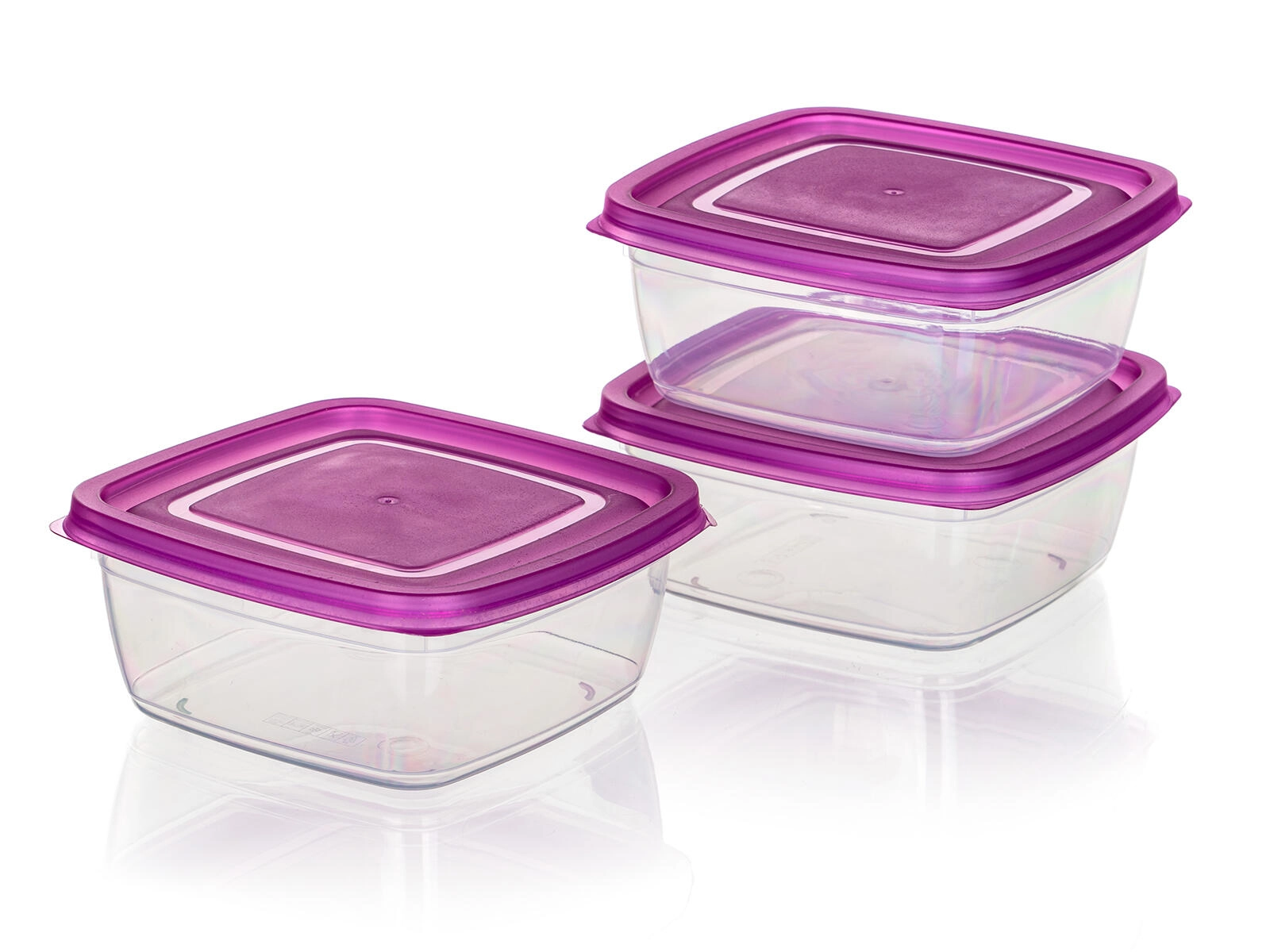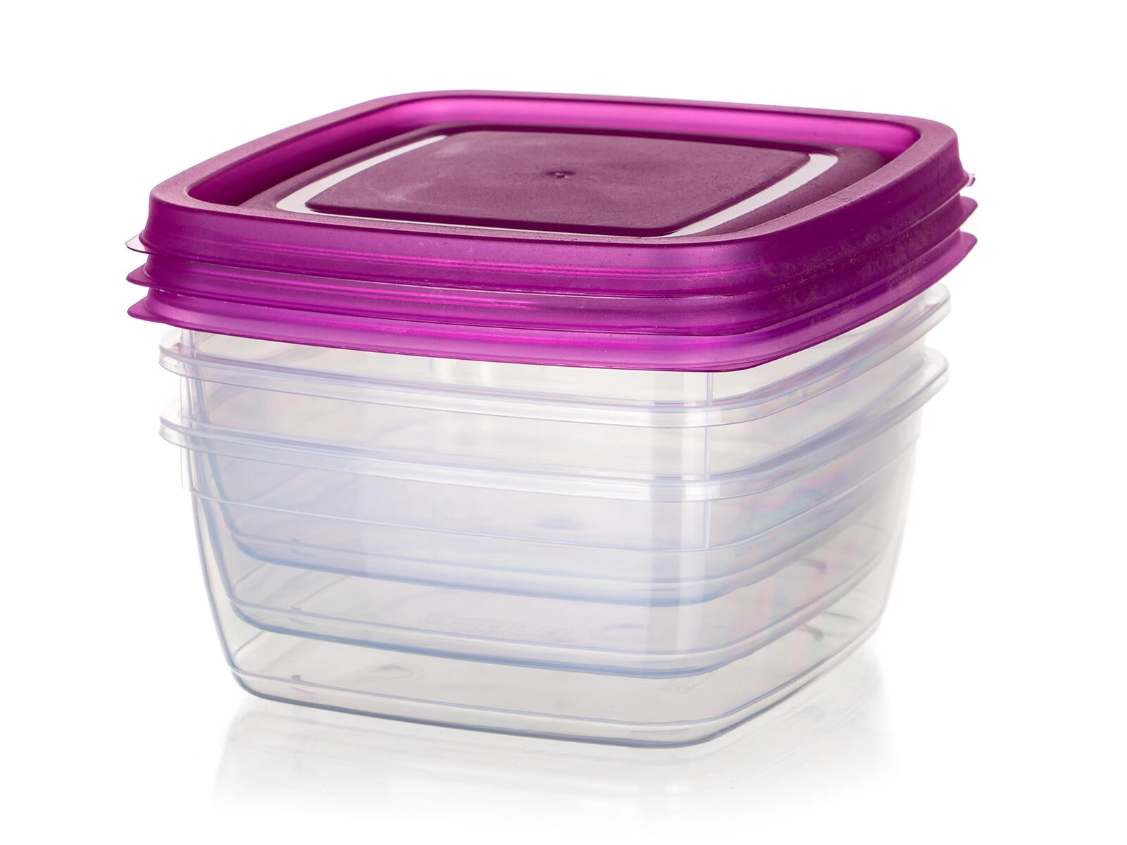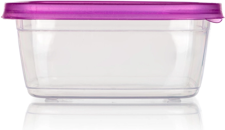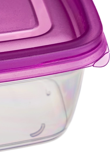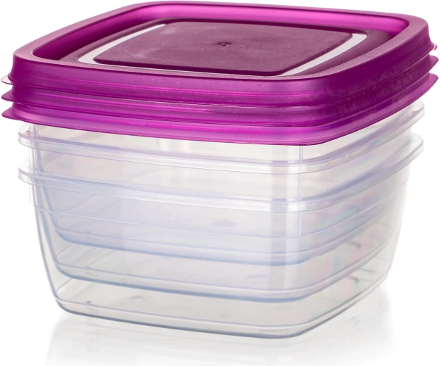 Met deze compacte set van 3 vierkante dozen van 0,5 l krijg je een slimme en esthetische oplossing voor voedselopslag. De doorzichtige containers van duurzame kunststof maken controle van de inhoud eenvoudig, terwijl de paarse deksels betrouwbaar vastklikken en helpen om je eten langer vers te houden.