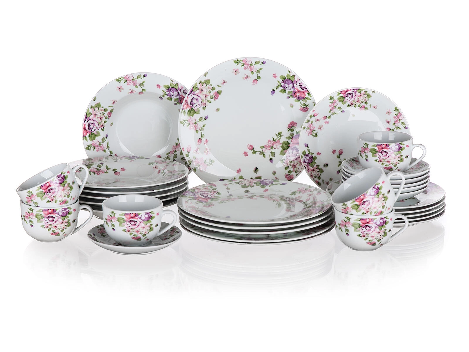 De set bevat 30 delen: 6 diepe, 6 platte en 6 dessertborden, 6 schoteltjes en 6 kopjes met een inhoud van 220 ml – ideaal voor zowel alledaags als feestelijk dineren.